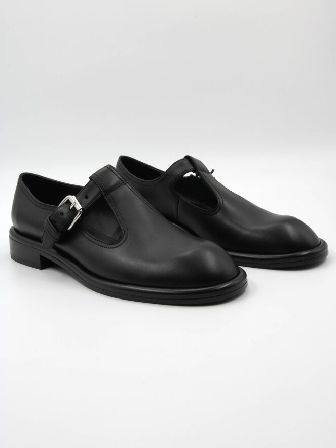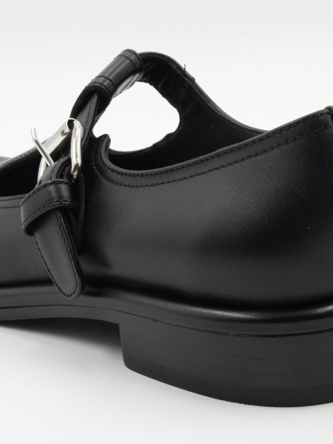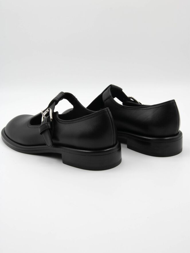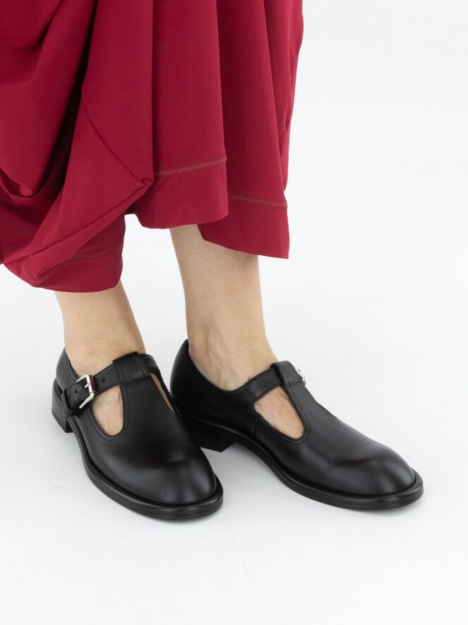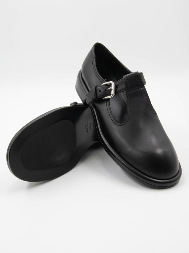 A slip-on from AGL in a "Mary Jane" model in black. The shoe has a round toe and the strap over the forefoot is adjustable.