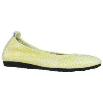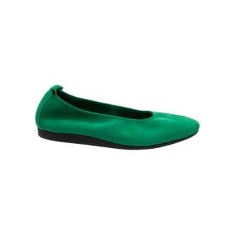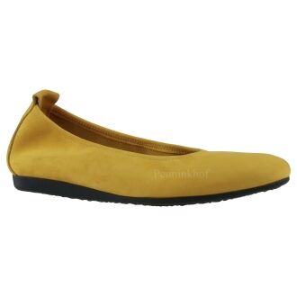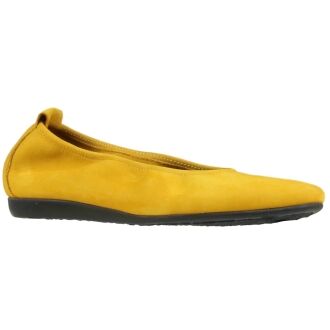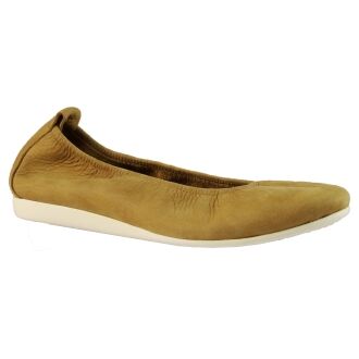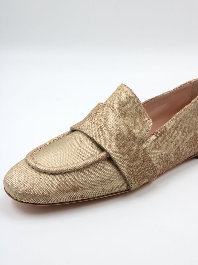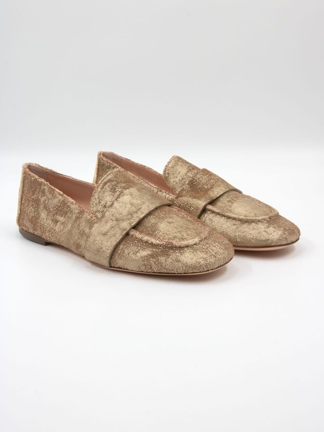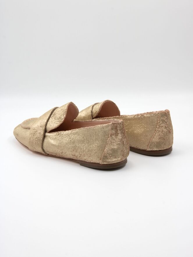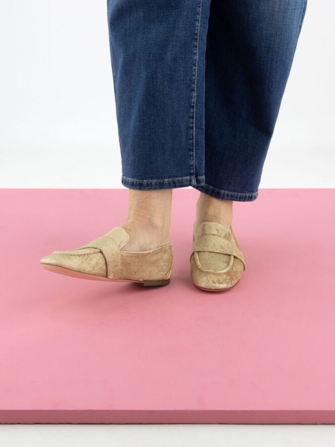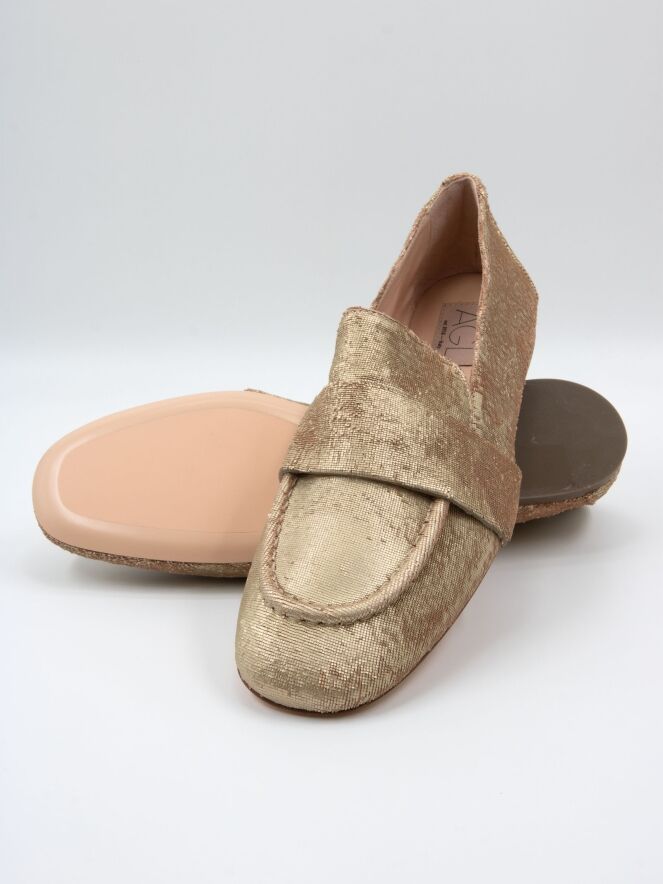 A slip-on shoe by AGL in a gold-colored velour fabric. A wide band runs across the forefoot. The interior is leather-lined.