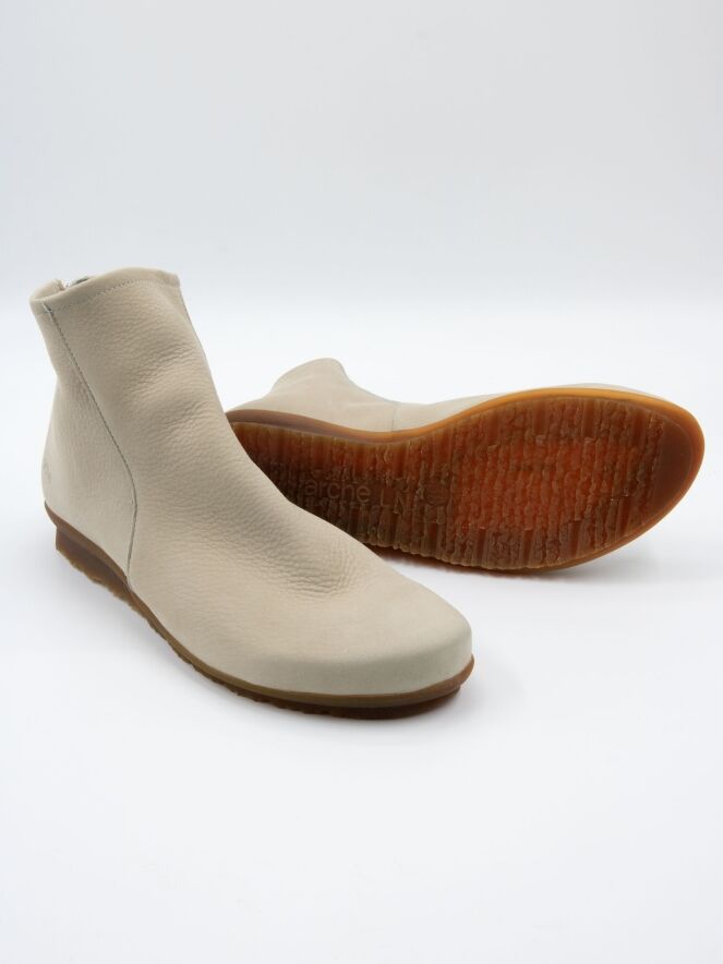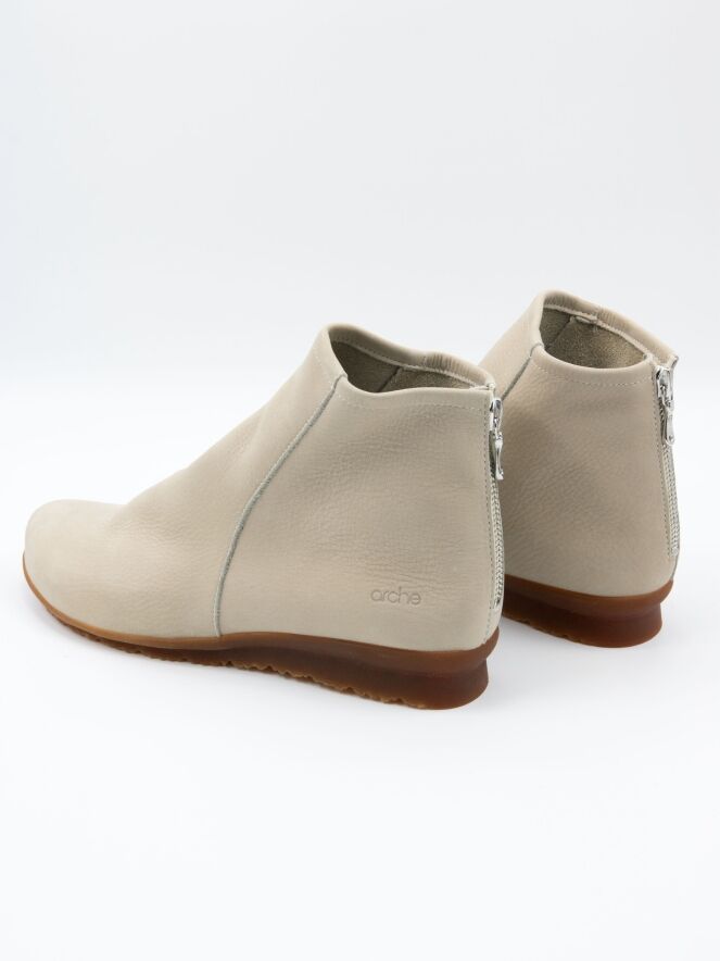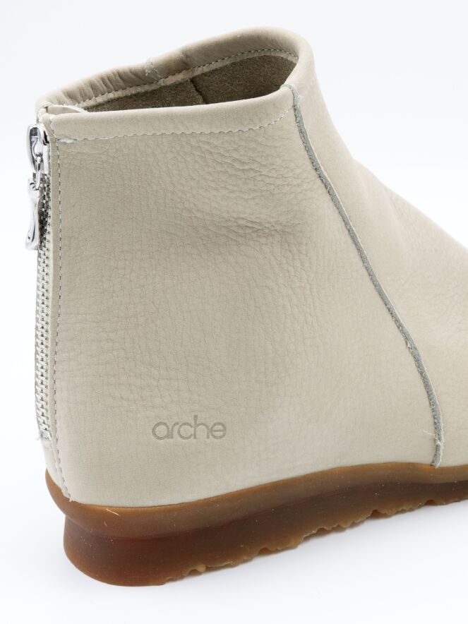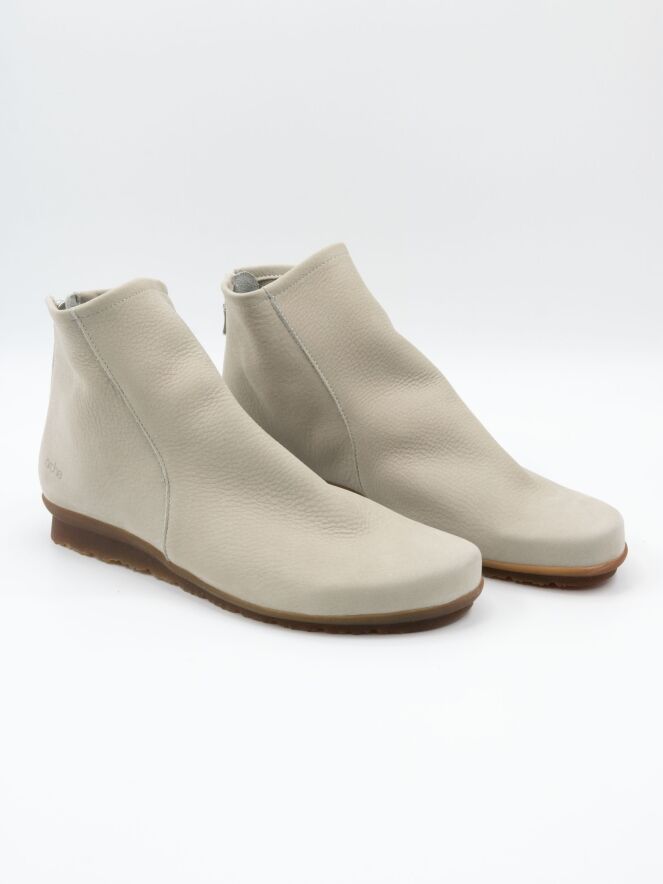 A short ankle boot by Arche in cream white color. There is a small zipper at the heel. The interior is unlined, and the boot has a round toe. The sole has a honey color.