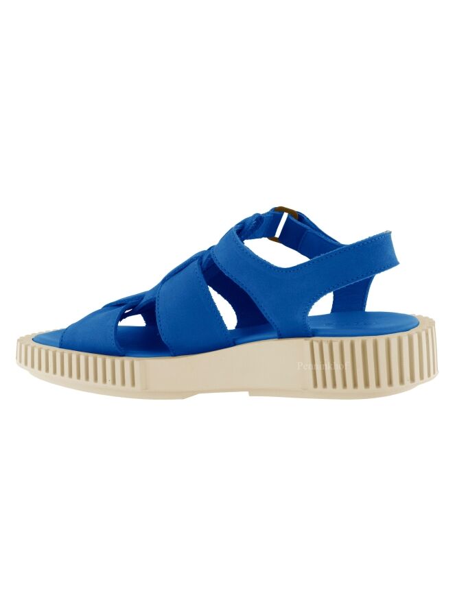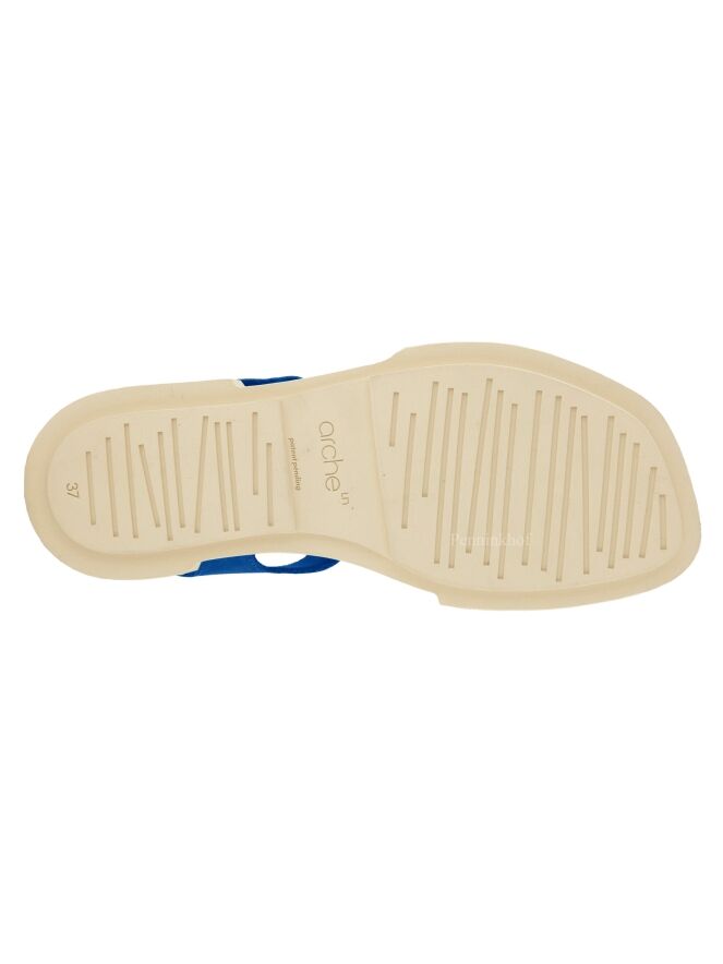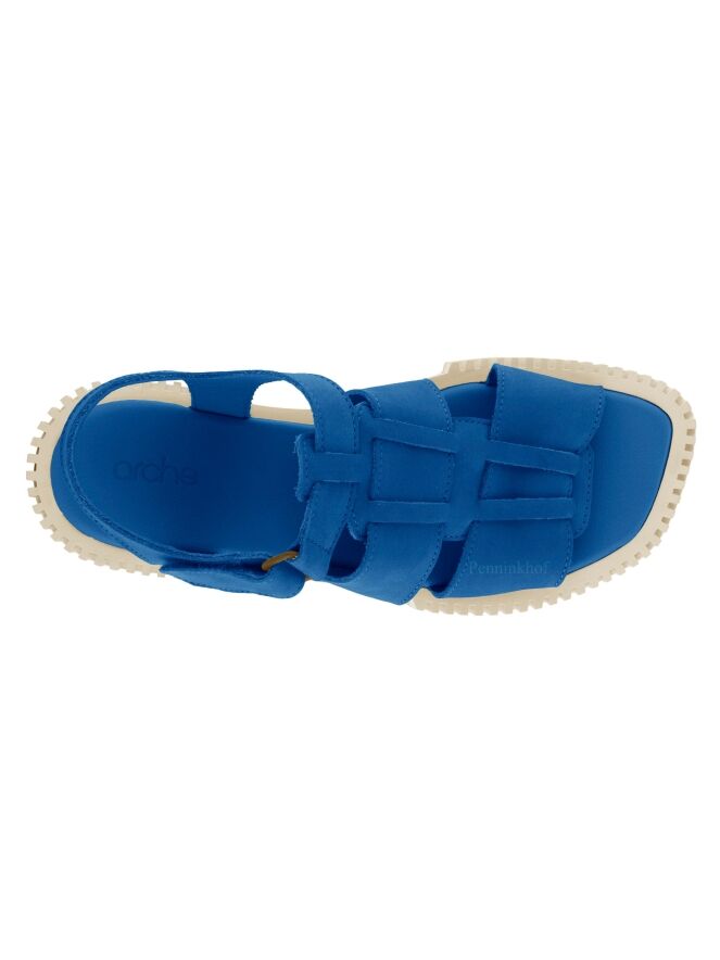 A sandal from Arche in a bright blue color. The sole is ribbed in straight lines. The closure around the foot is adjustable with Velcro.