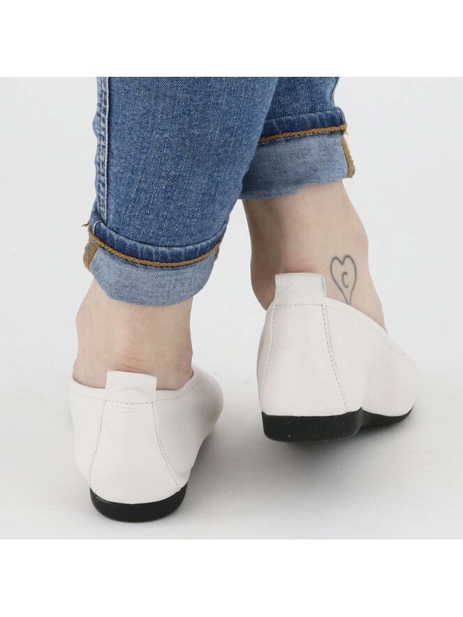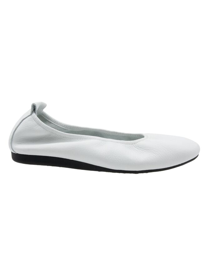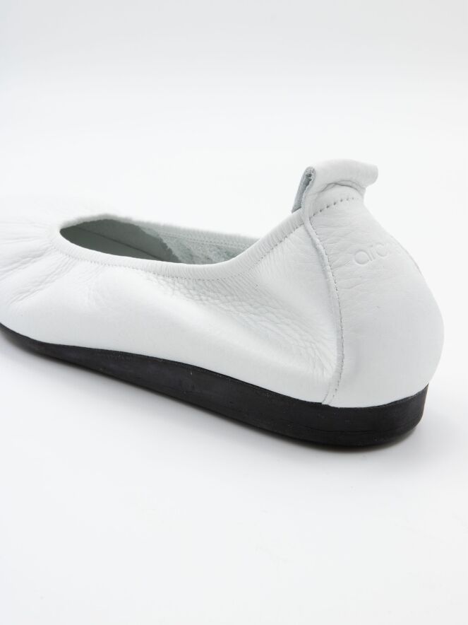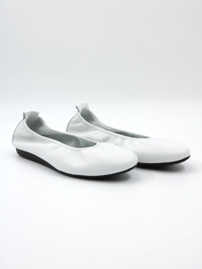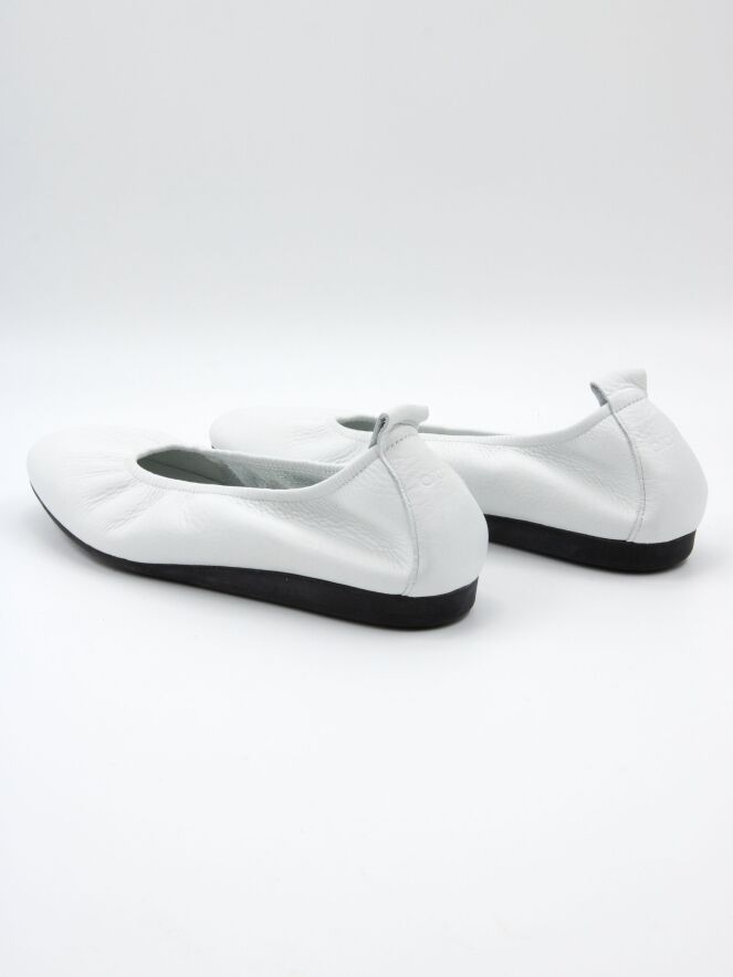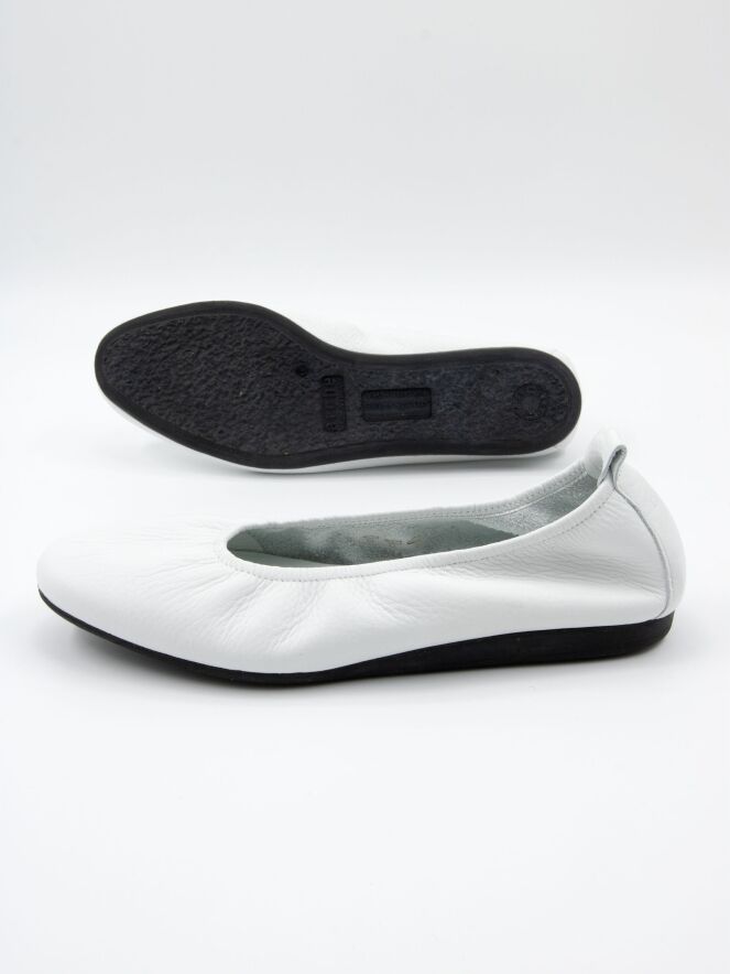 The Laius model in white. A classic design from the brand Arche. This ballerina is crafted from high-quality calf leather and features a flexible latex sole. The model is monochrome with a beautifully rounded toe. The interior is unlined, providing a supple fit. The heel of the sole is slightly elevated for added comfort.