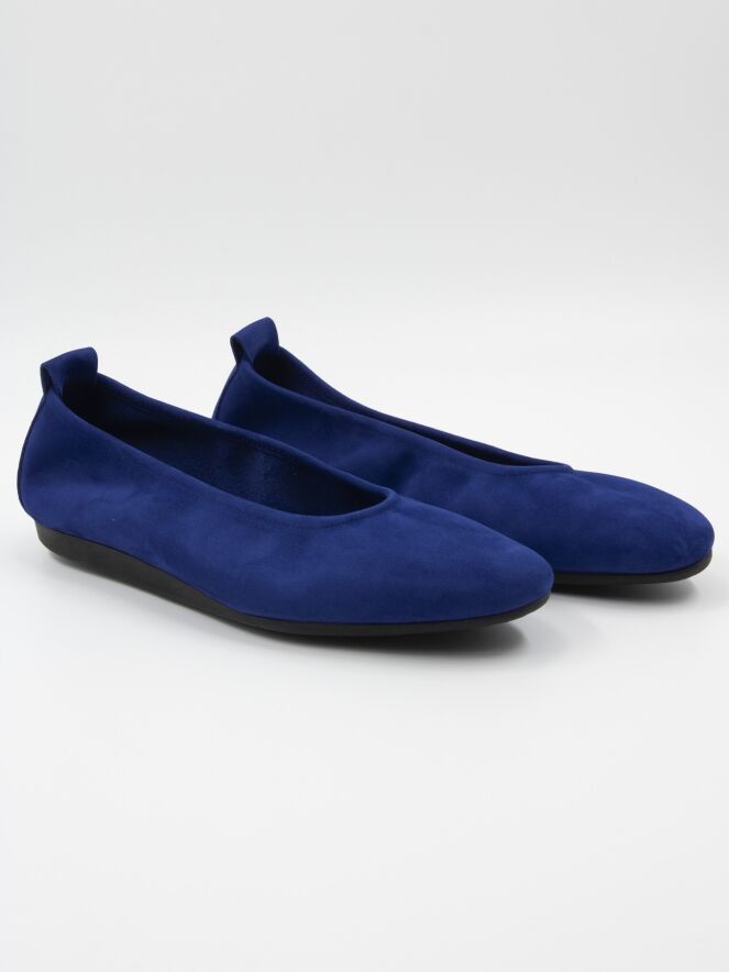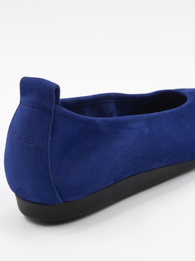 The model "Laius" by the brand Arche in the color cobalt blue. These ballerina flats are made of high-quality nubuck suede and have a latex sole. The model is in a solid color. The tip of the ballerina is nicely rounded. The inside of the ballerina is not lined. The back part of the sole is slightly elevated, which adds to the comfort.