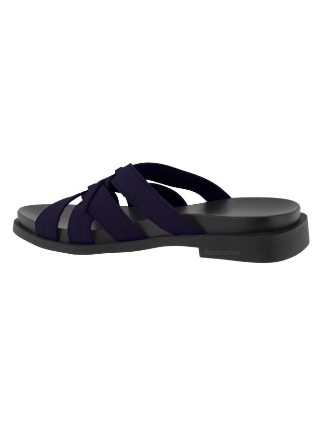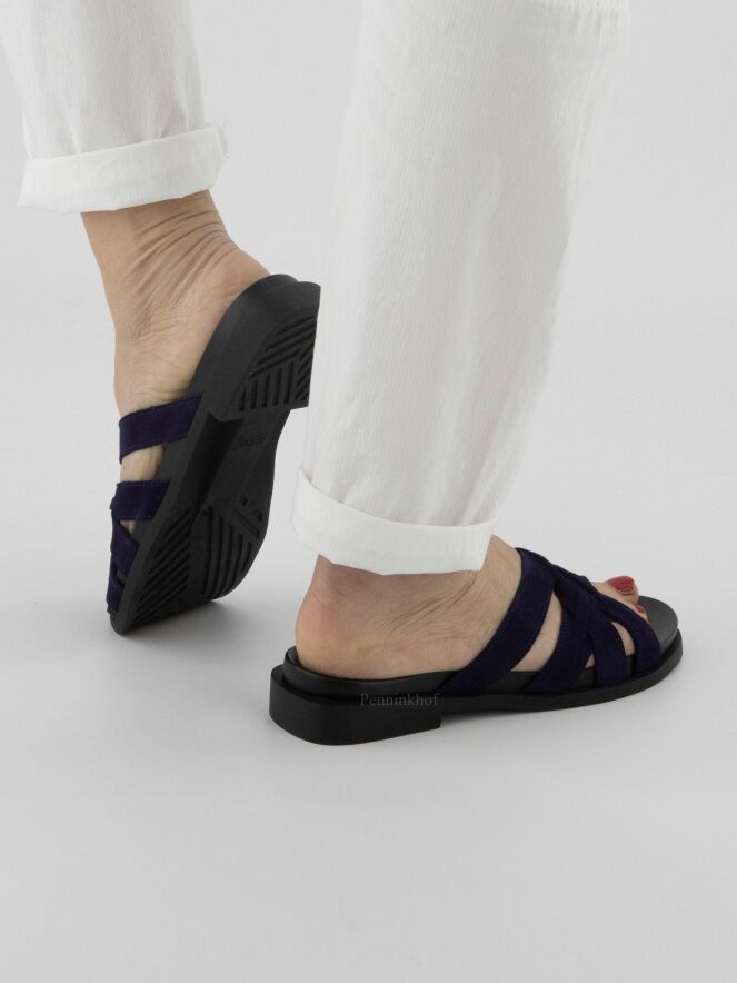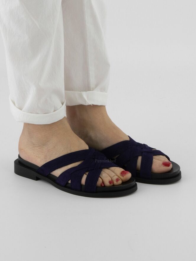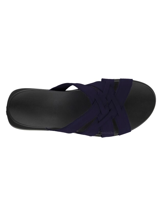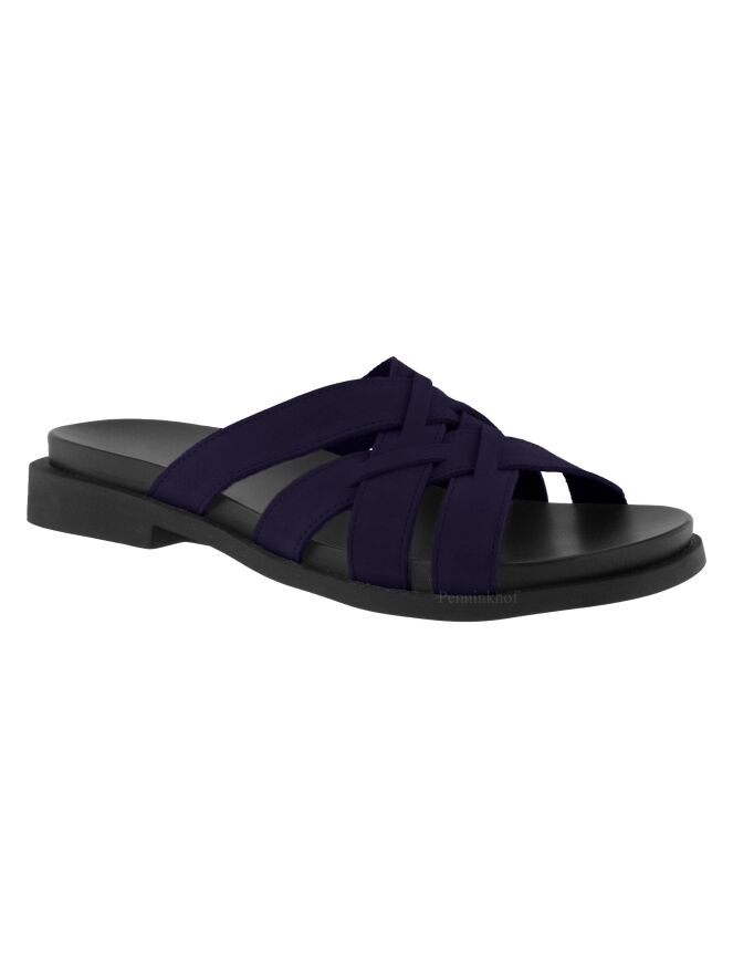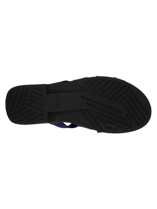A slipper from Arche in the color dark purple. A soft footbed has been placed on the latex sole. The nubuck suede is with 4 crossed straps over the forefoot.