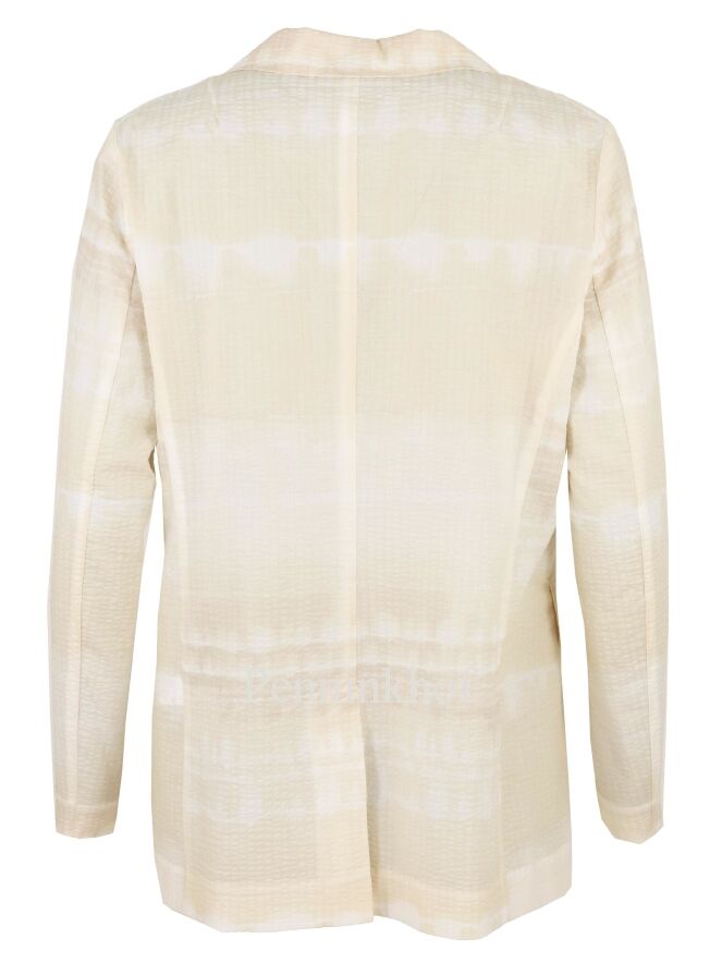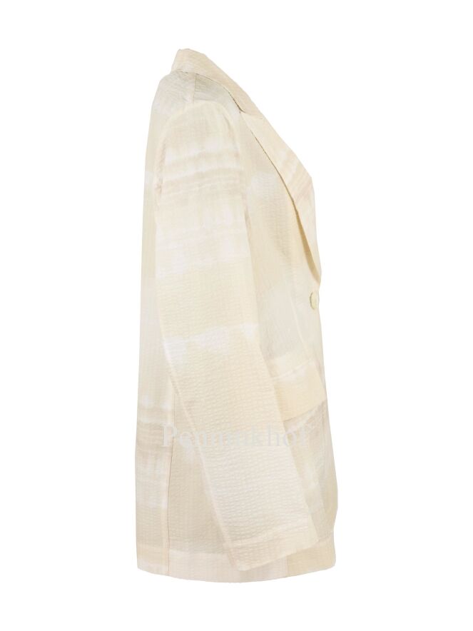 An unlined blazer from Beatrice B. in a batik print with the colors white and vanilla. The fabric has a fine waffle structure. The blazer has a one-button closure and can be hand washed.