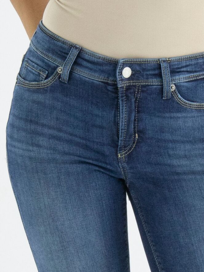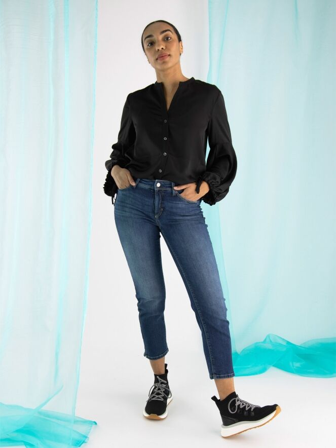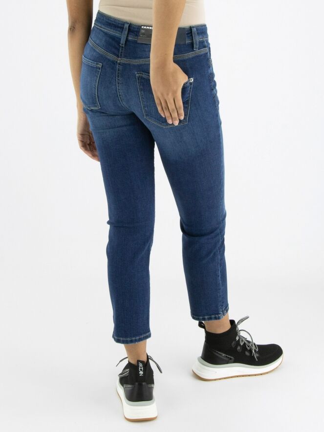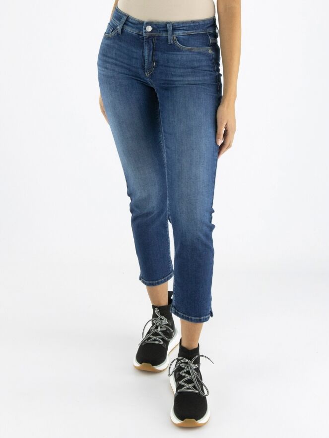 A short pair of jeans by Cambio in a basic denim color. The jeans are in a 5-pocket model, and there is a short slit on both sides at the bottom. These jeans can be washed at 30 degrees.