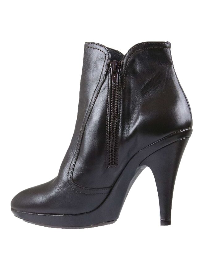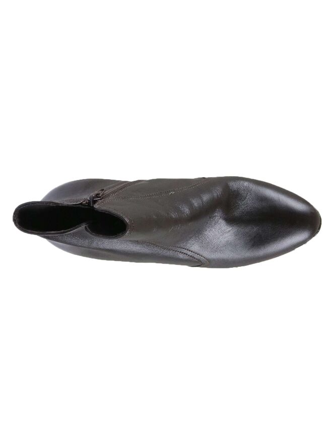 An ankle boot from Cristian Daniel in the color mocha brown. The boot has a platform sole and a round toe. there is a zipper on the inside. The inside is lined with leather.