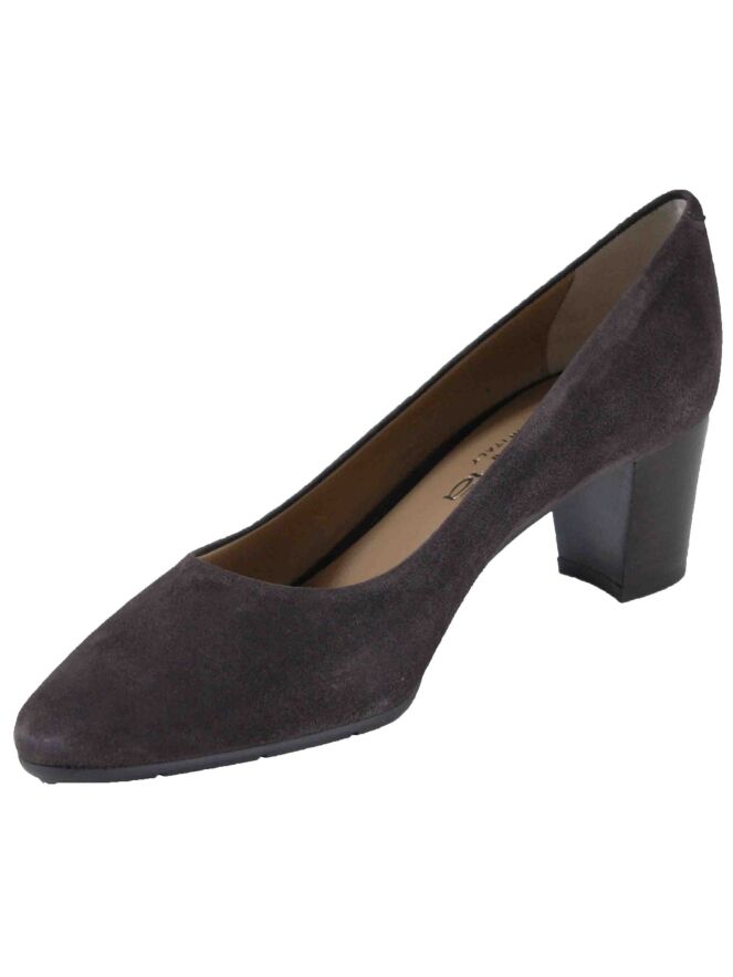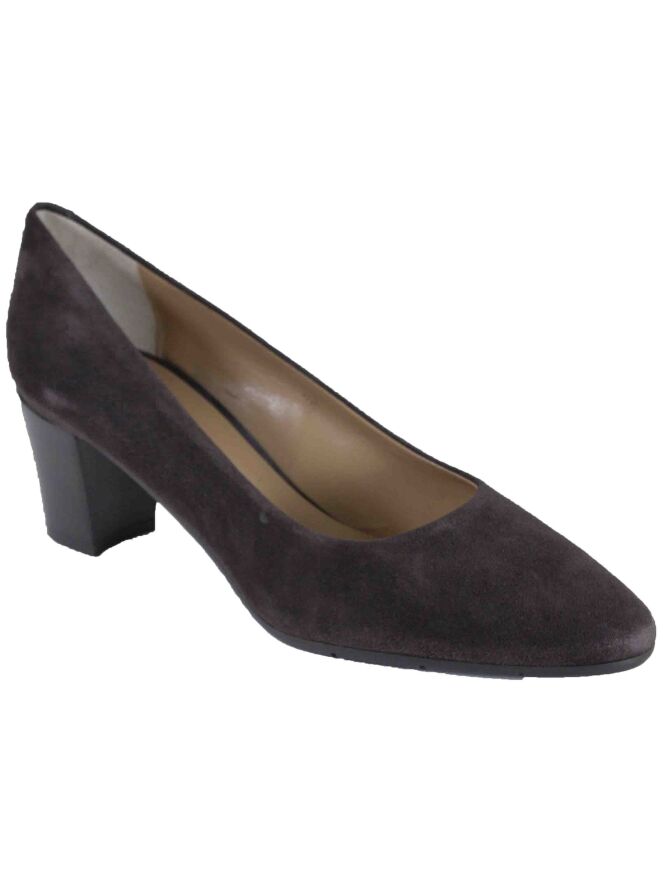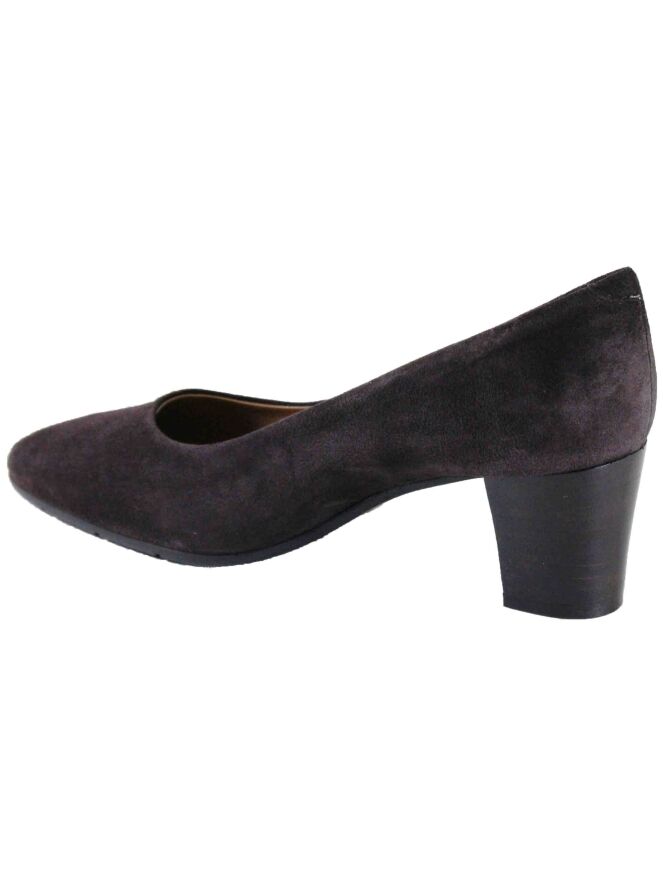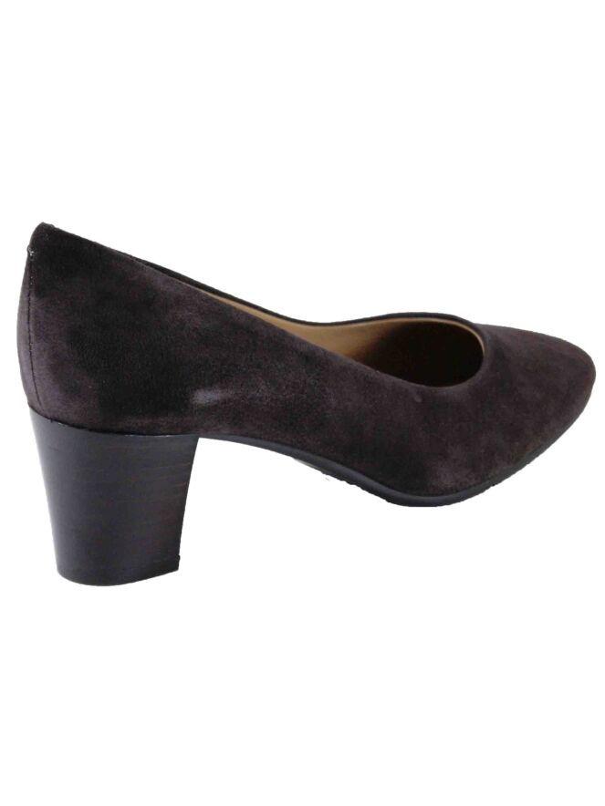 A pump by the brand Evaluna in a mocha brown color. The pump has an elegant block heel and the toe is slightly pointed and round finished. This pump is on the inside with leather lined.