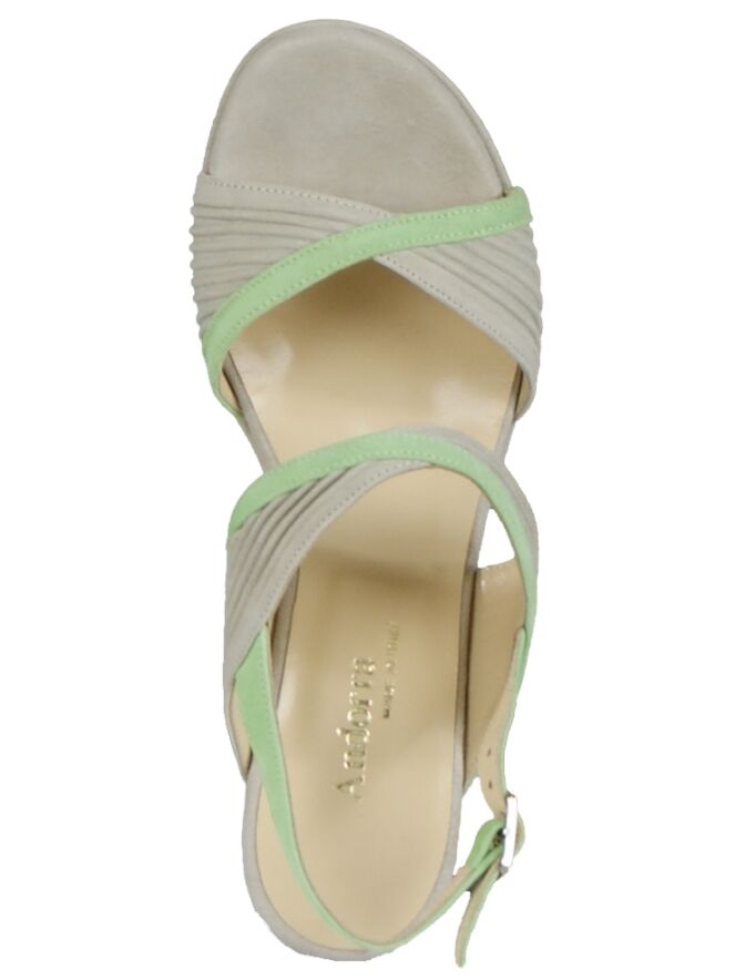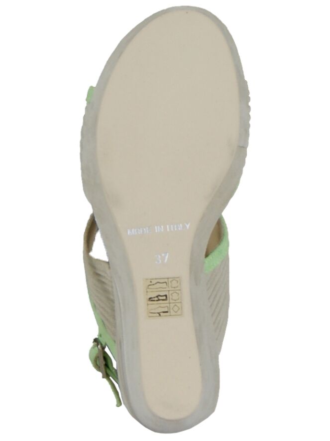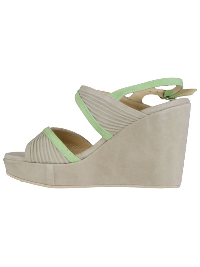 A sandal of the brand Even & Odd in the color taupe with a wedge heel. The sandal has an open heel and an open toe. The suede is finely pleated. The sandal has as extra detail 2 pistache green trims and an pistache -colored anklet. The inside of the pump is lined with leather.
