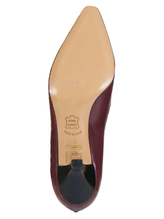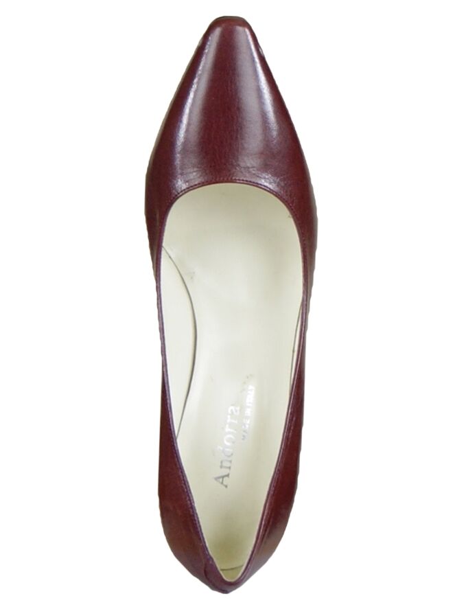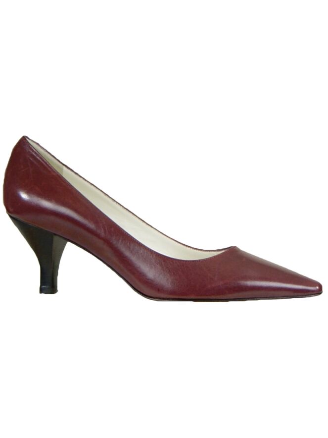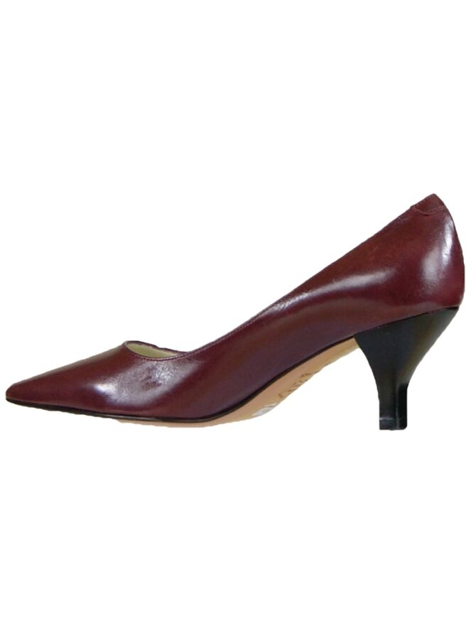 A pump of the brand Even & Odd in the color purple. The pump has a pointed toe and the heel is in a black color. The inside of the pump is lined with leather.