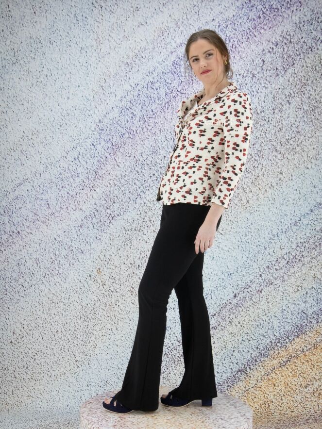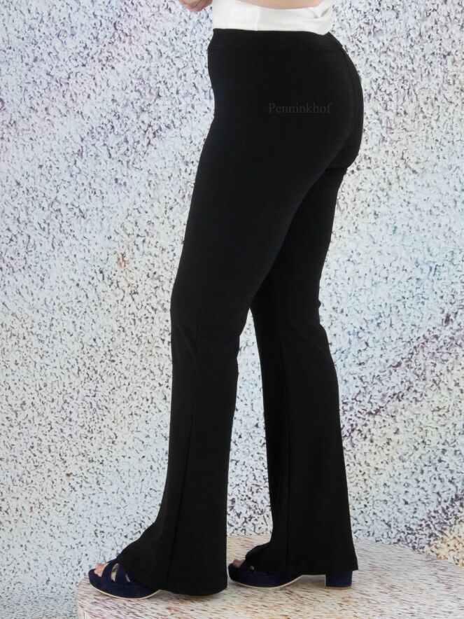 Flared pants by Joseph Ribkoff in the color black. At the waist is an elastic band. There is a pleat in the middle of the legs. These pants can be hand washed.