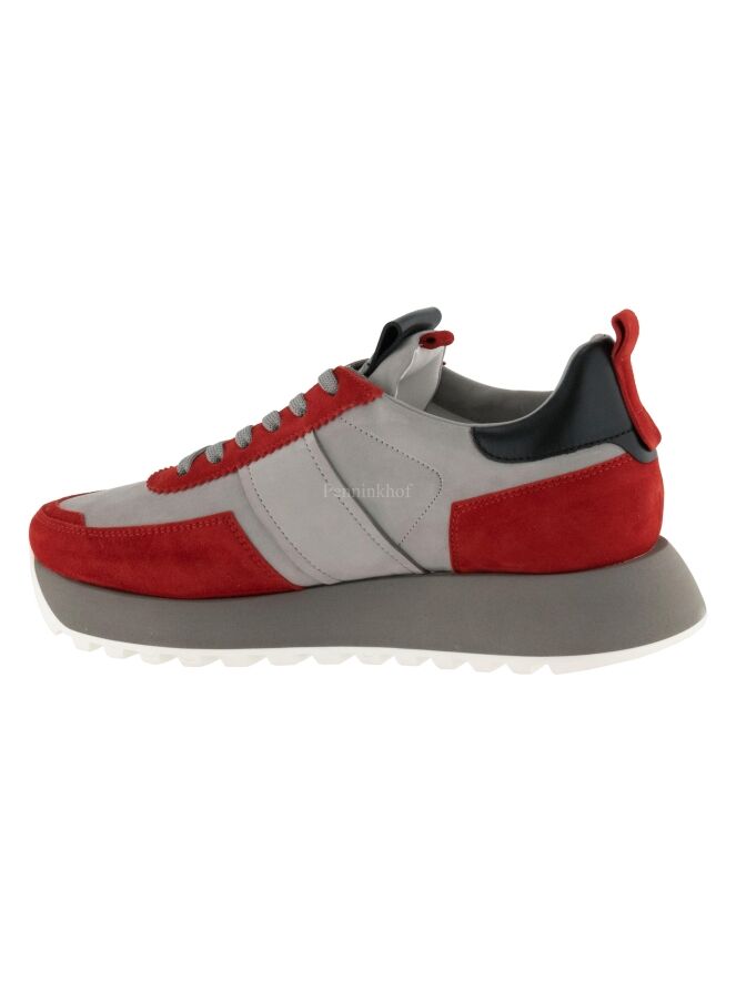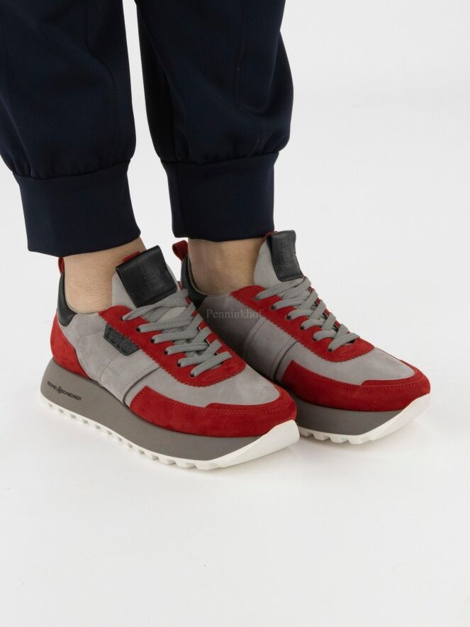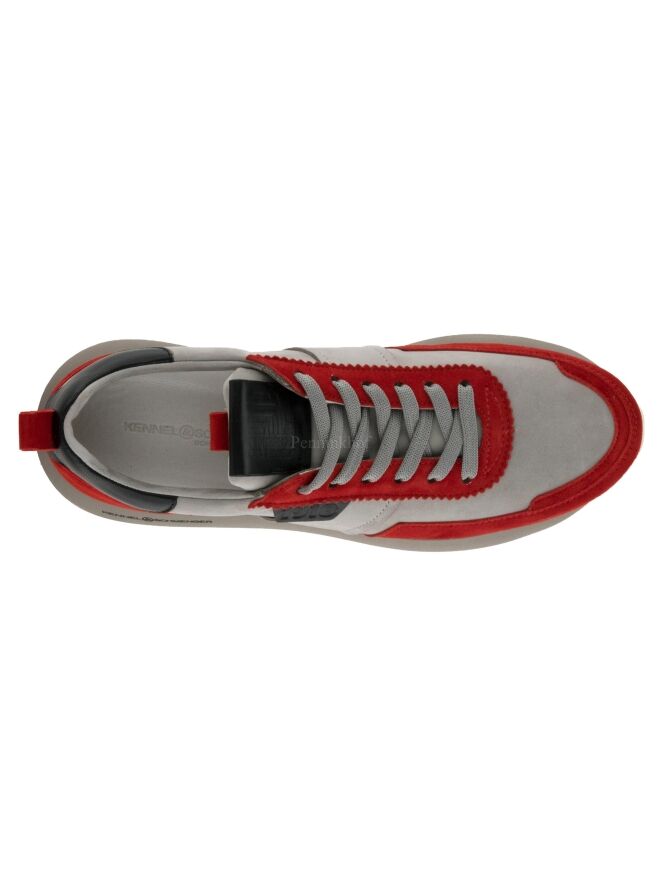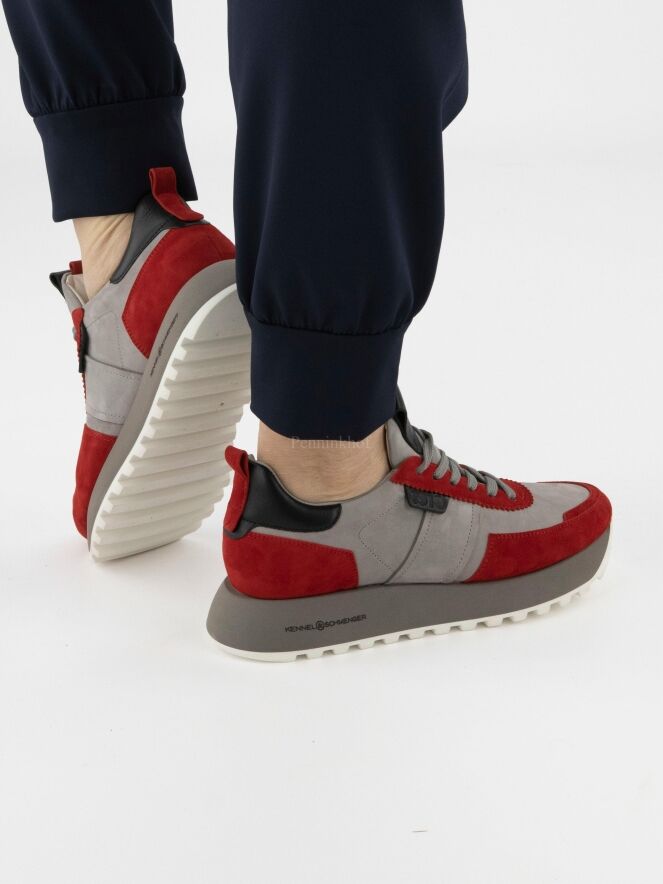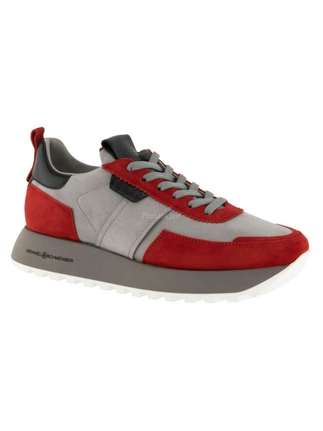 A sneaker from Kennel & Schmenger in red with gray camoscio suede. ON the tongue and the heel of the sneaker is a piece of black leather. The sneaker has a serrated gray platform sole.