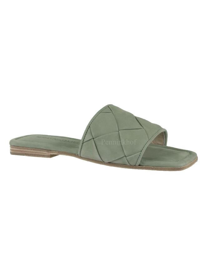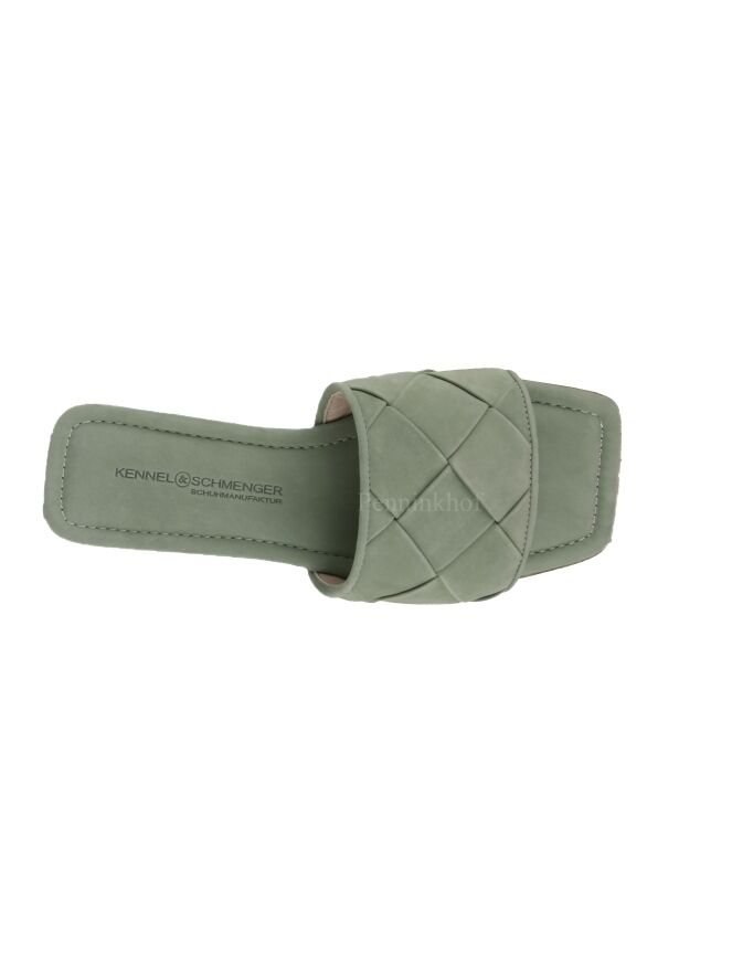 A slipper from Kennel & Schmenger in the color olive green. The wide band over the forefoot is braided. The flip flop has a square toe.