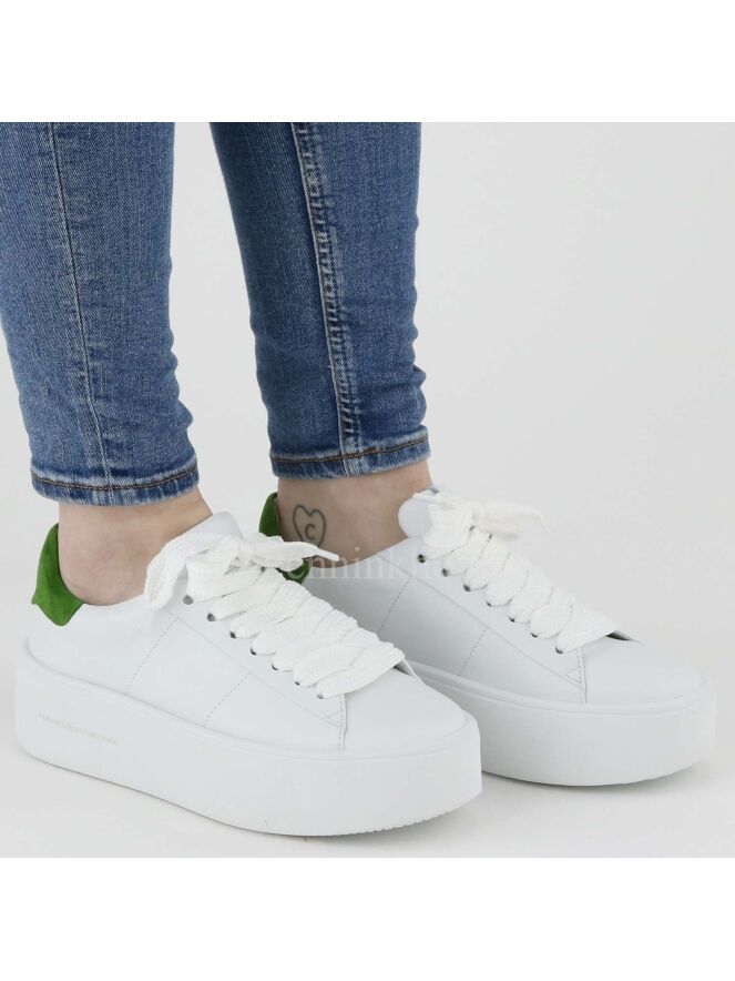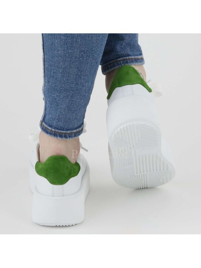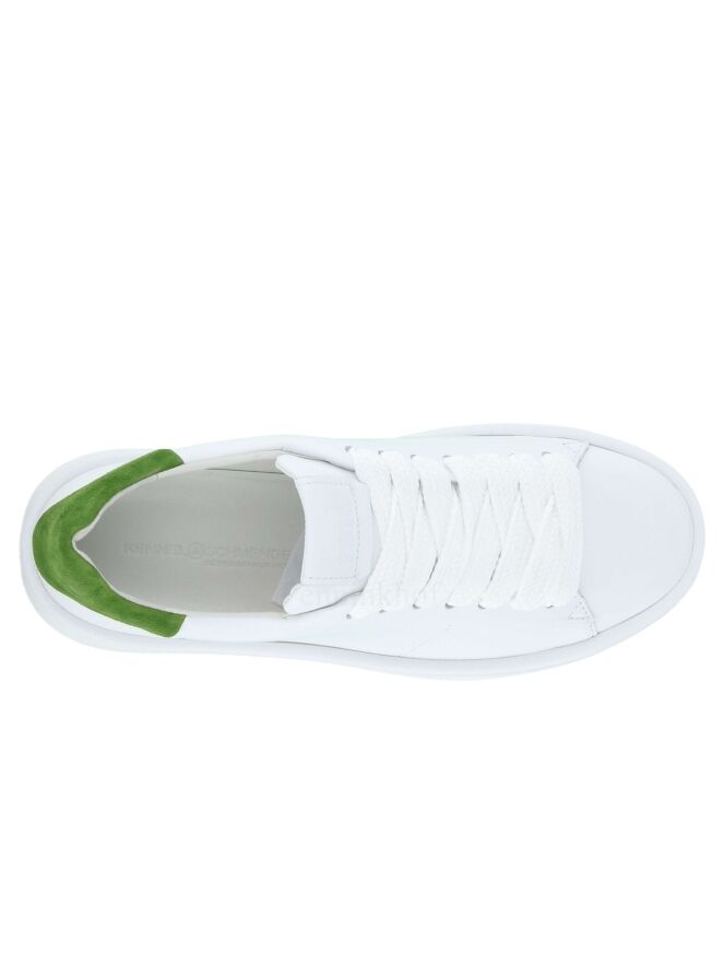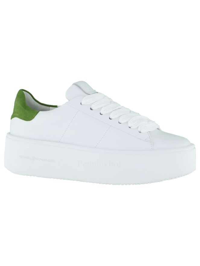 A sneaker from Kennel & Schmenger in the color white. A green piece of nubuck has been processed on the heel. The platform sole is in the color white. The inside is lined with leather.