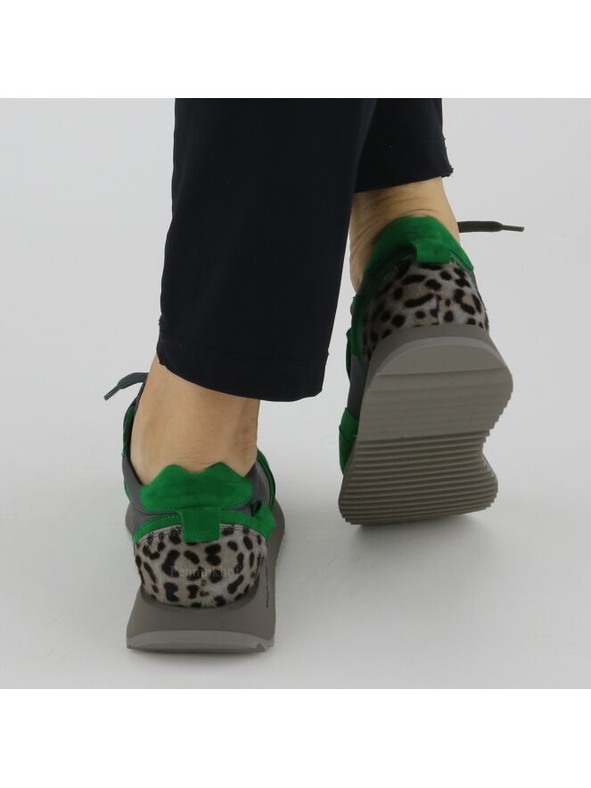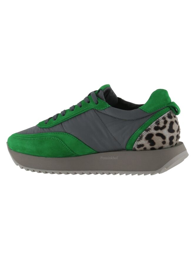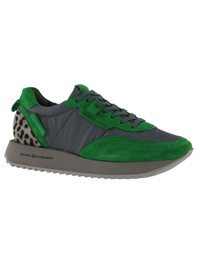 A sneaker from Kennel & Schmenger in the color green with gray. Along the laces, bottom edge along the forefoot and the nose are in a green nubuck suede. The forefoot and sides are in a gray parachute fabric and the heel is in shaved fur in a leopard print. The sole is finely serrated and built up in 2 layers with the colors light and dark grey. The inside is lined with leather.