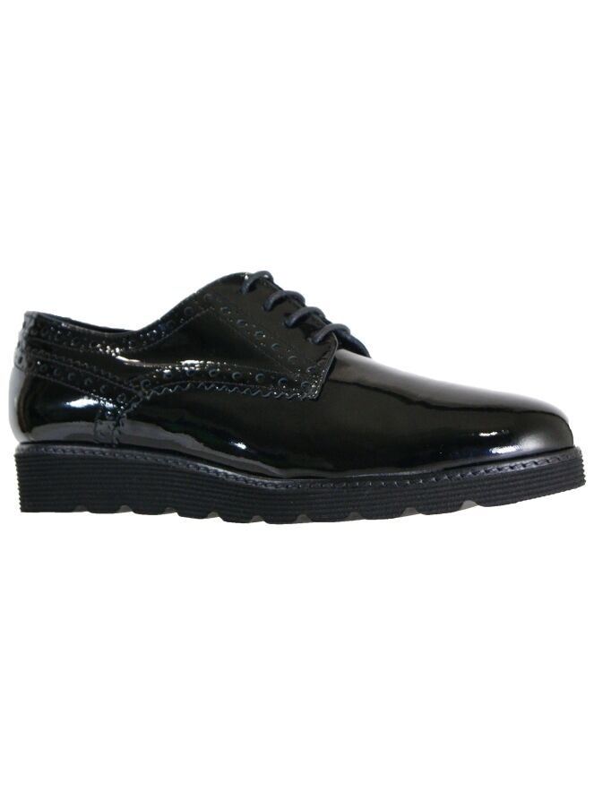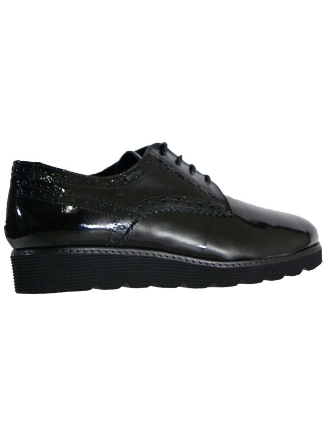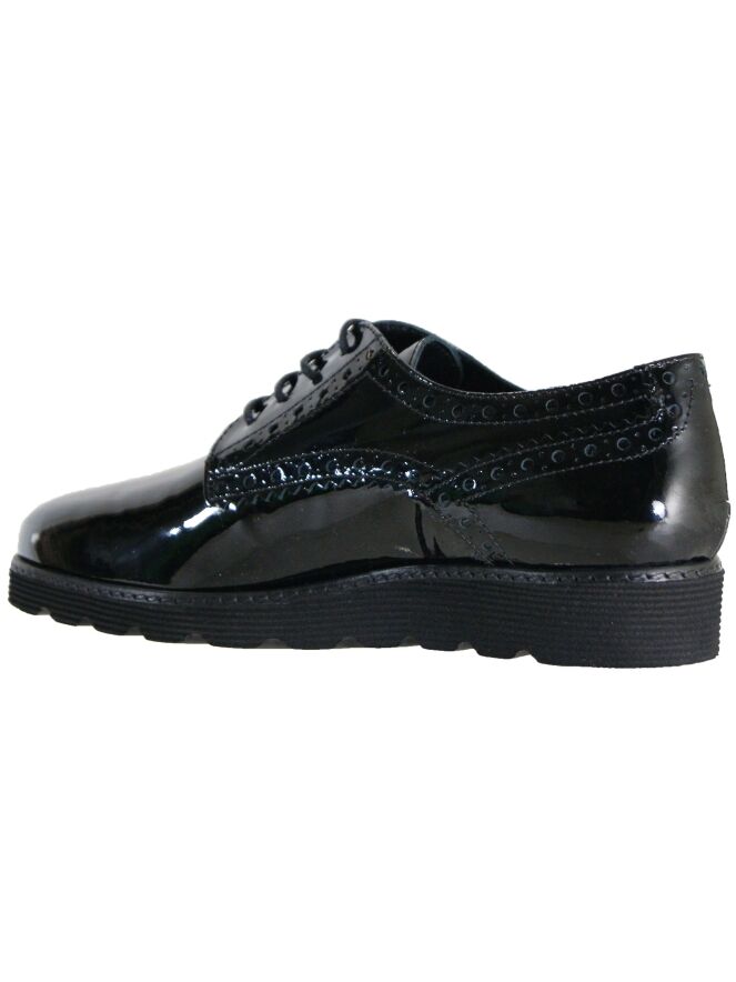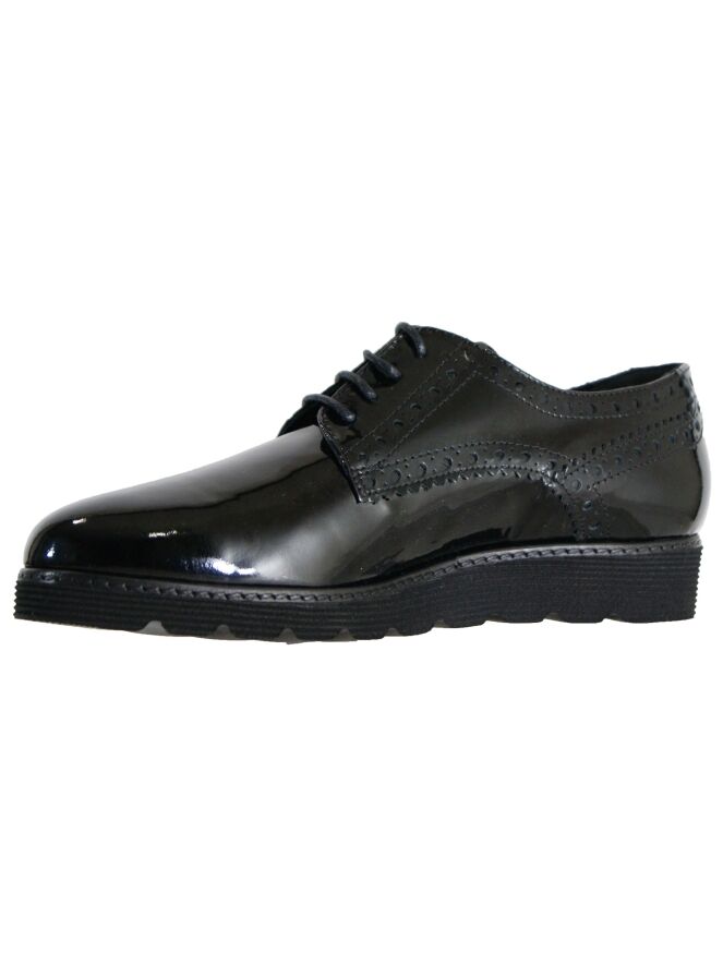 A lace-up shoes of the brand Luca Mode in a patent leather in the color black. The shoe has brooks details along the sides and heel. The sporty sole is good pliable. This shoe is leather lined on the inside.