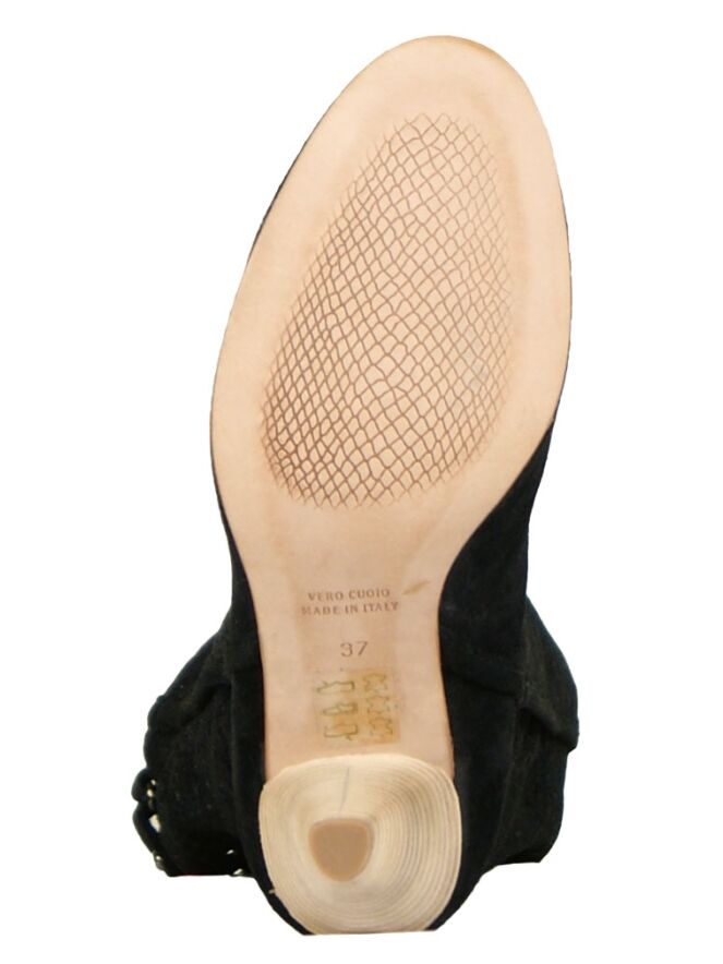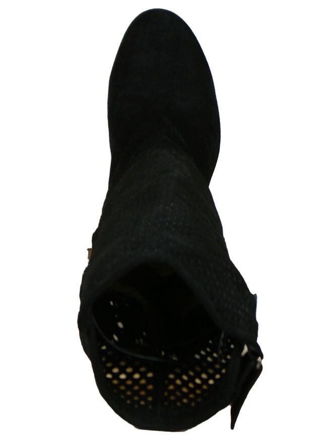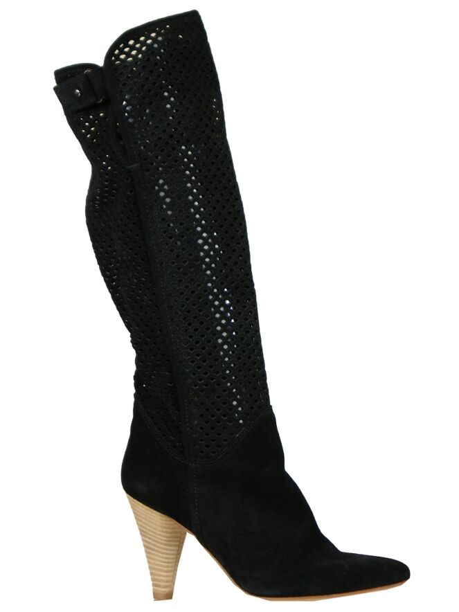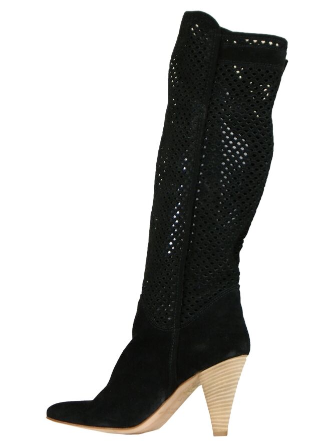 A high boot by the brand Luca Mode in a black color. The shaft of the boot is of perforated leather which while wearing somewhat goes down. The elegant heel of the boot is in light brown. The height of the shaft is 42 cm and the circumference is 37 cm.