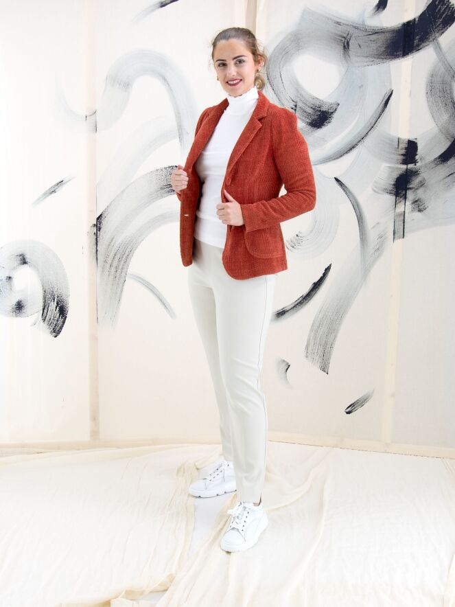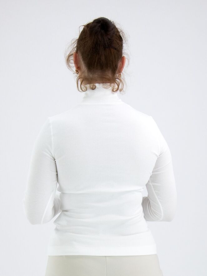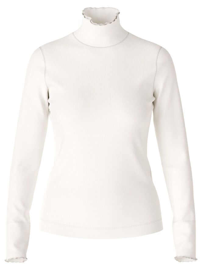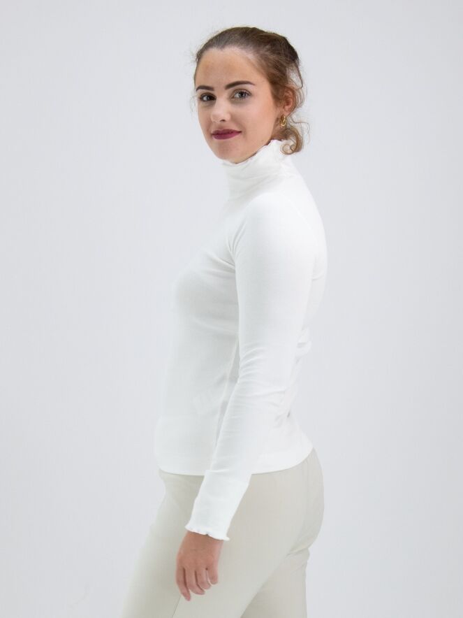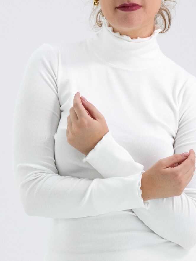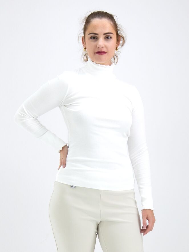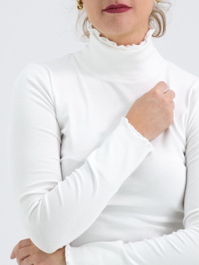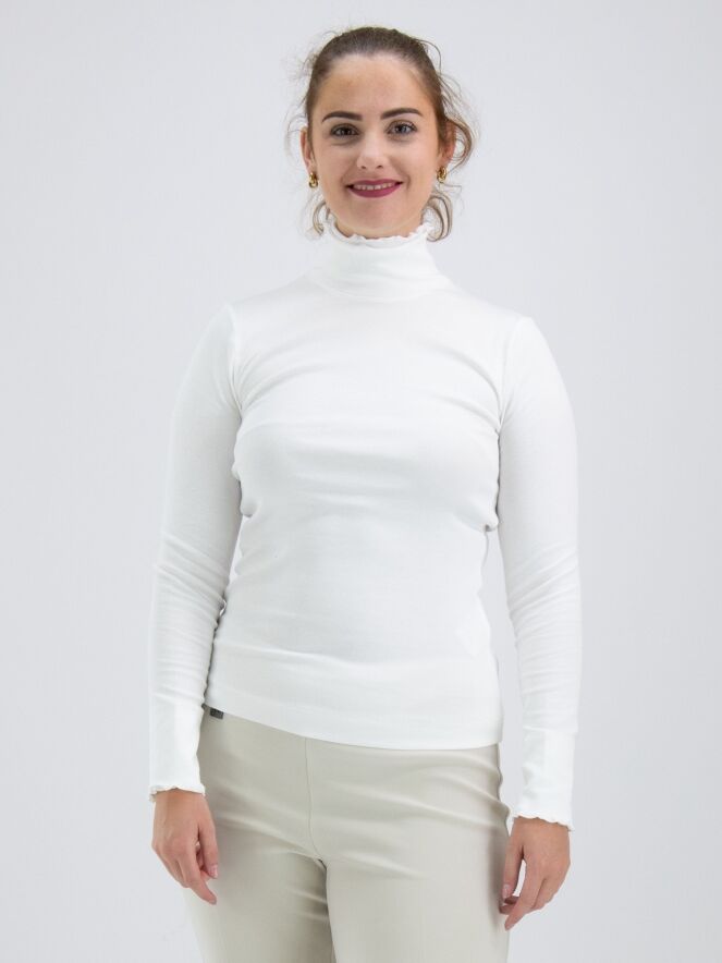 A fine ribbed shirt from Marc Cain in cream white. The shirt has a turtle neck with a wavy edge. This detail returns at the end of the long sleeves. This shirt may be washed at 30 degrees.