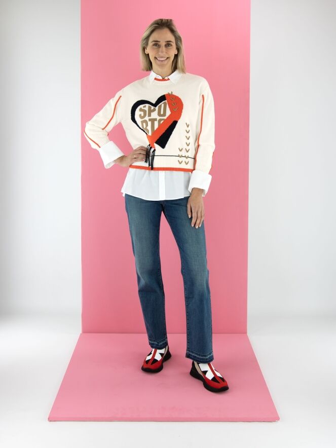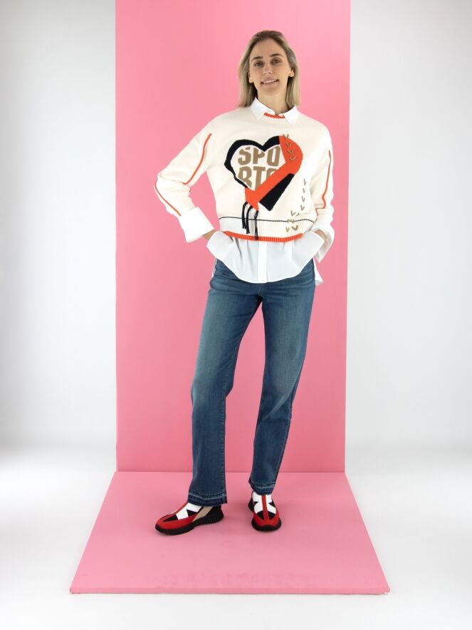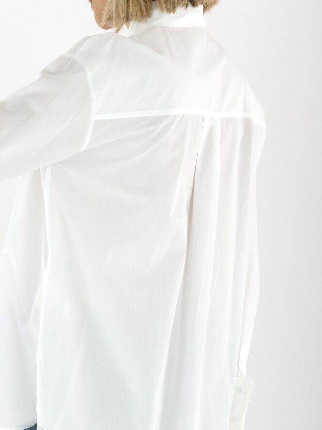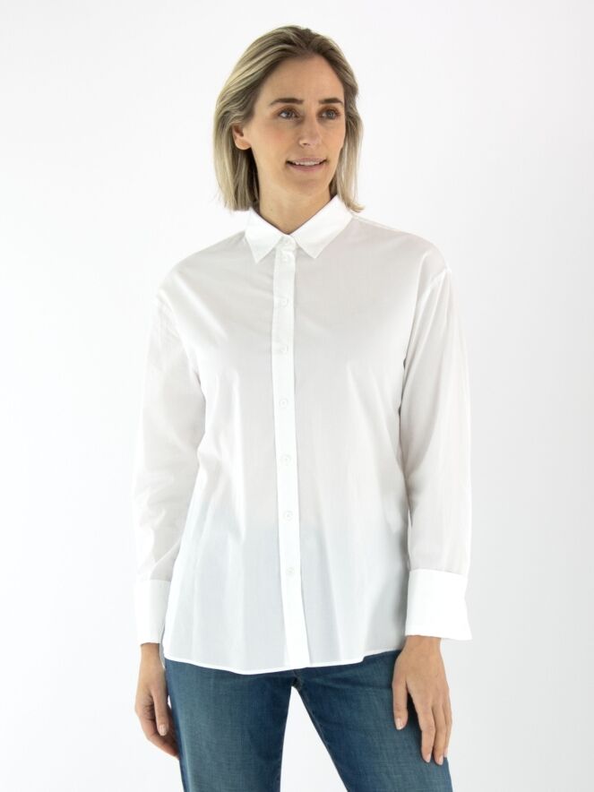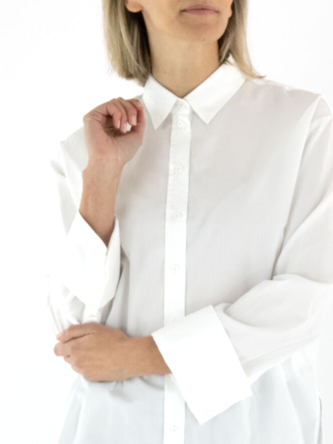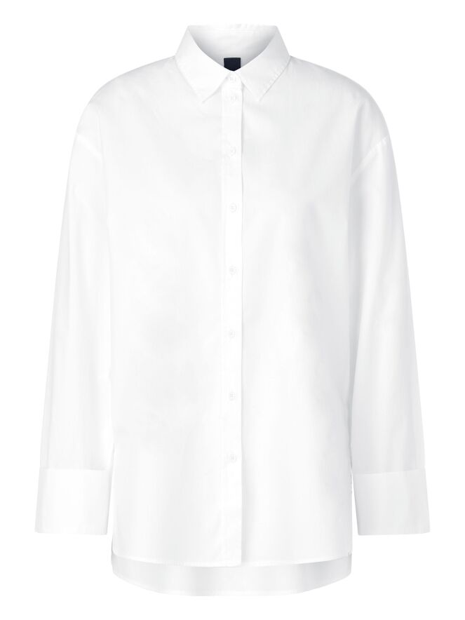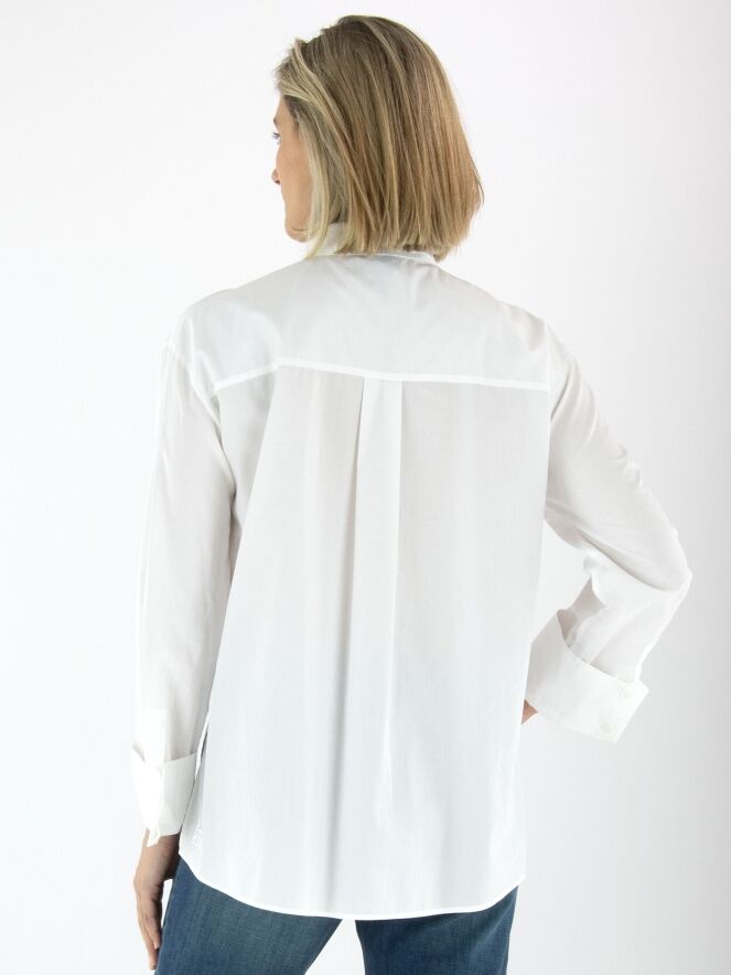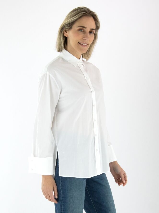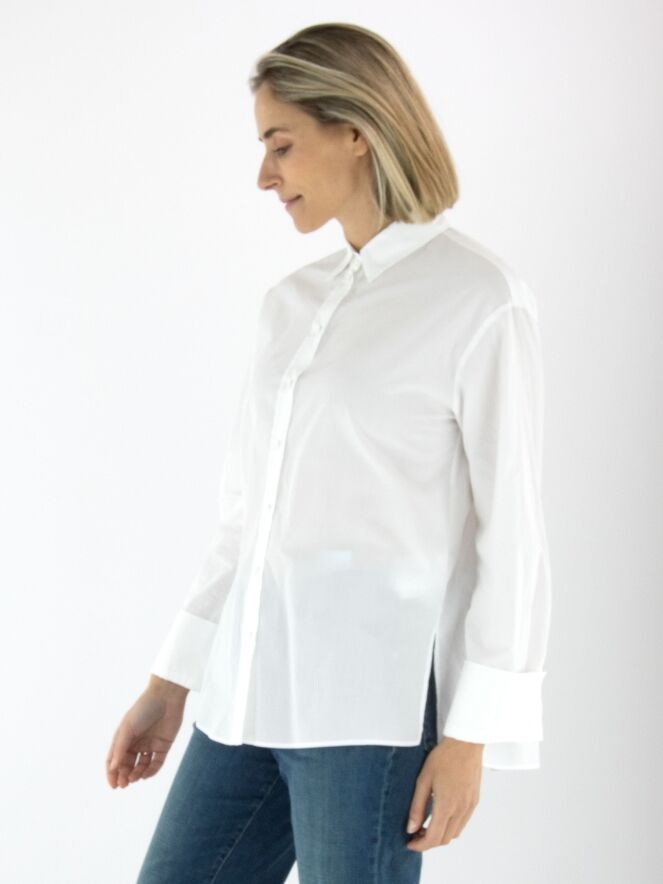 A white blouse by Marc Cain. At the bottom, there are short slits on both sides. The ends of the long sleeves feature wide cuffs. This blouse can be washed at 30 degrees.