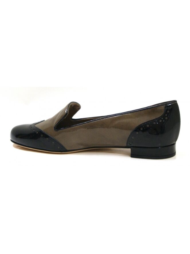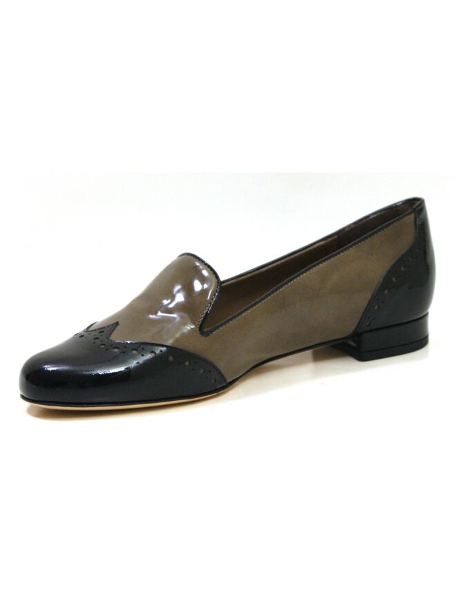 A loafer of the brand Prezioso in a taupe color. The loafer has brooks details. The heel and the toe are in black patent leather. Along the edge of is a very narrow band in leather. The inside of the shoe is lined with leather.