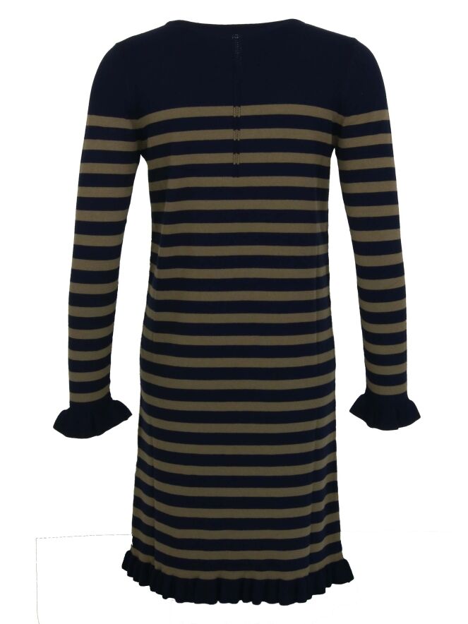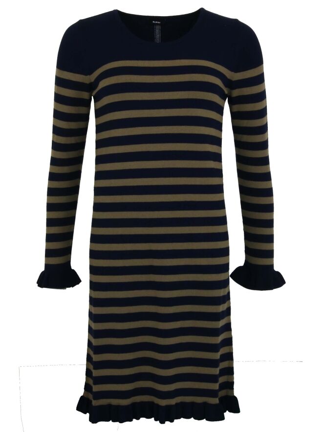 A dress by Riani in a stripes pattern with the colors navy blue and khaki. At the ends of the long sleeves and at the bottom of the dress is a pleated hem. This dress can be washed by hand.
