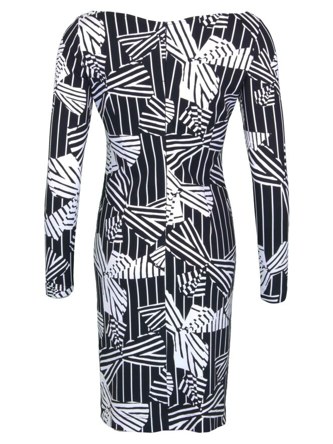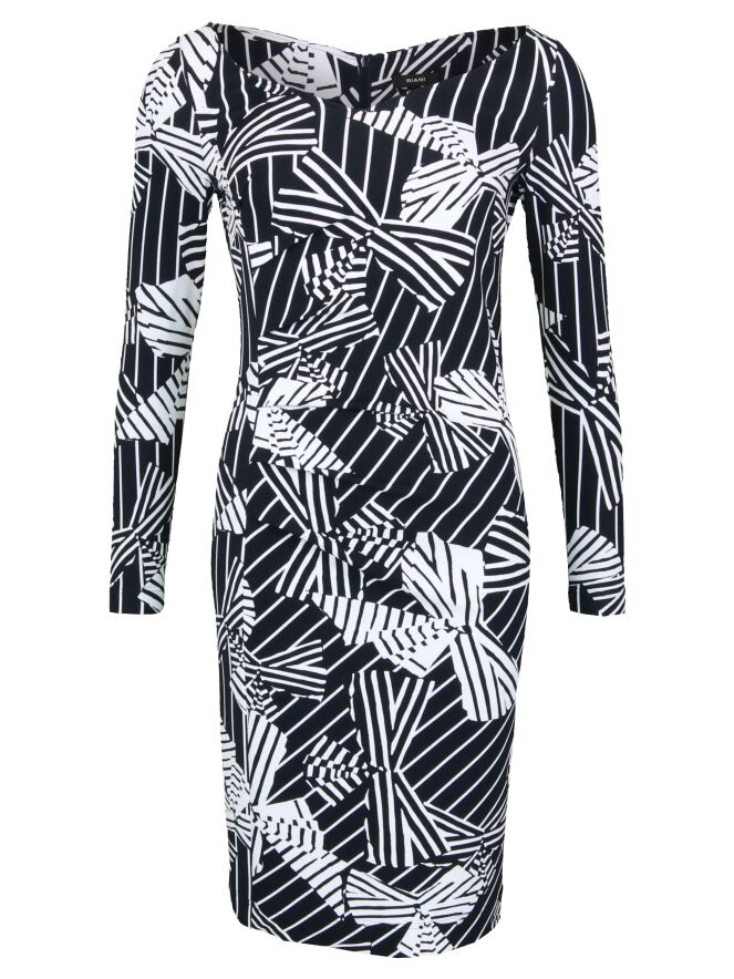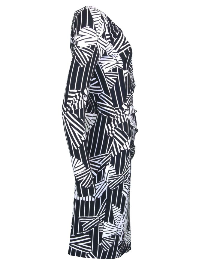 Une robe de Riani dans un imprimé graphique de noeuds dans les couleurs bleu marine avec blanc. Sur le côté droit, il y a plusieurs plis à la taille, ce qui donne un effet drapé. La robe a un col en V rond et ne doit pas être lavée.