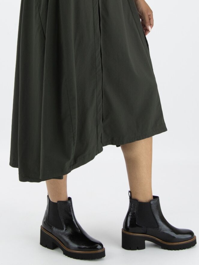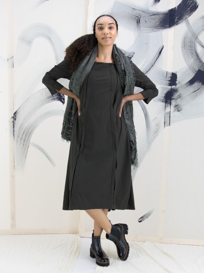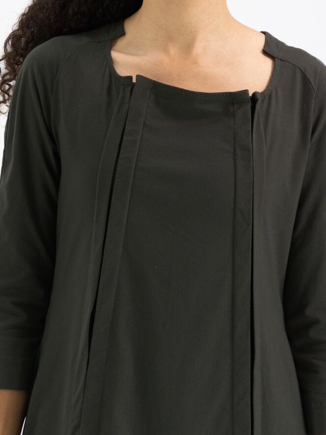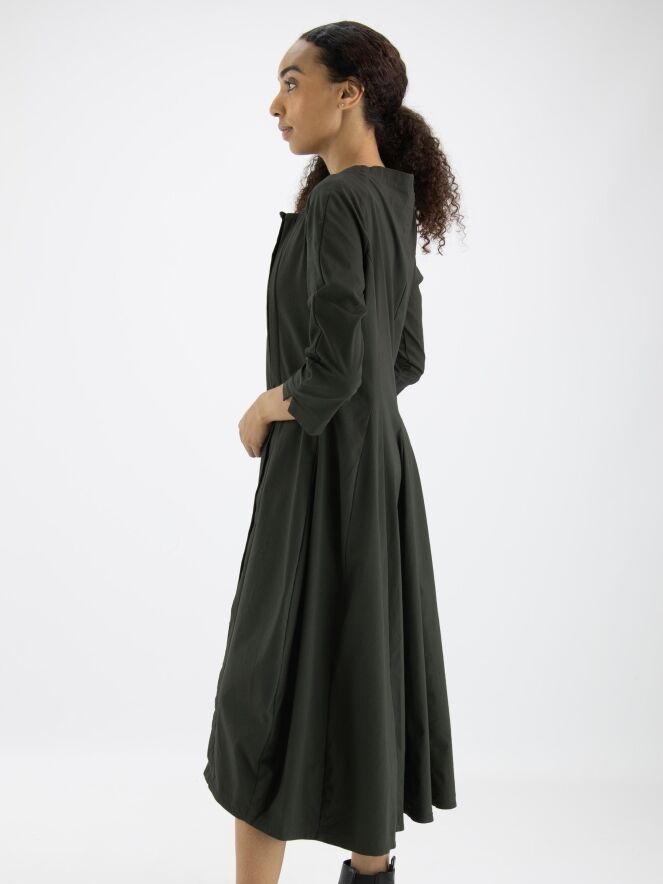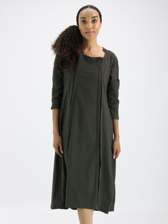 Een jurk van Rundholz Black Label in een khakikleur. Aan de voorzijde zijn twee verticale omgekeerde plooien die openstaan. De jurk heeft een lichte taillelijn en een ballonvorm vanuit de taille. De brede hals heeft vanaf de zijkanten naar de achterzijde een kleine verhoging. Aan het uiteinde van de halflange mouwen is een kort splitje. Deze jurk mag op 30 graden worden gewassen.