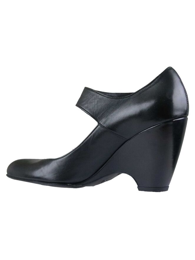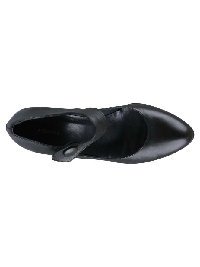 A pump from Zapa market in the color black. Over the instep is a strap with a button closure. The pump has a round nose and the inside is lined with leather.