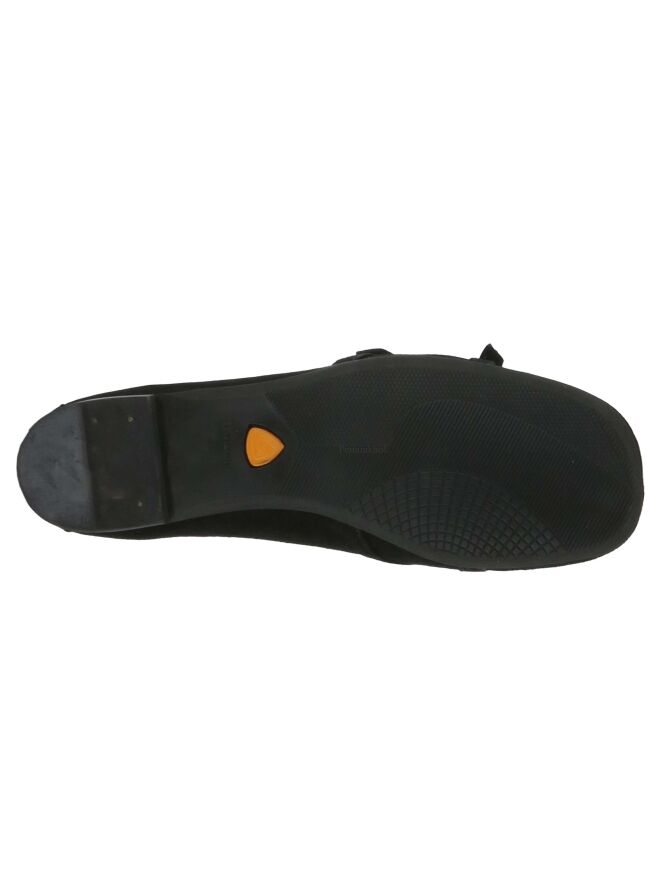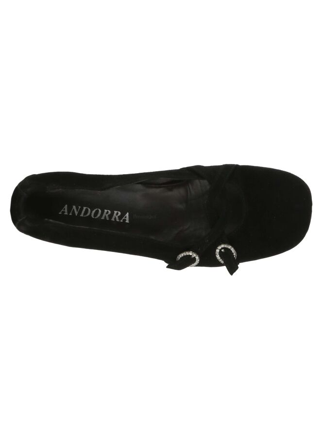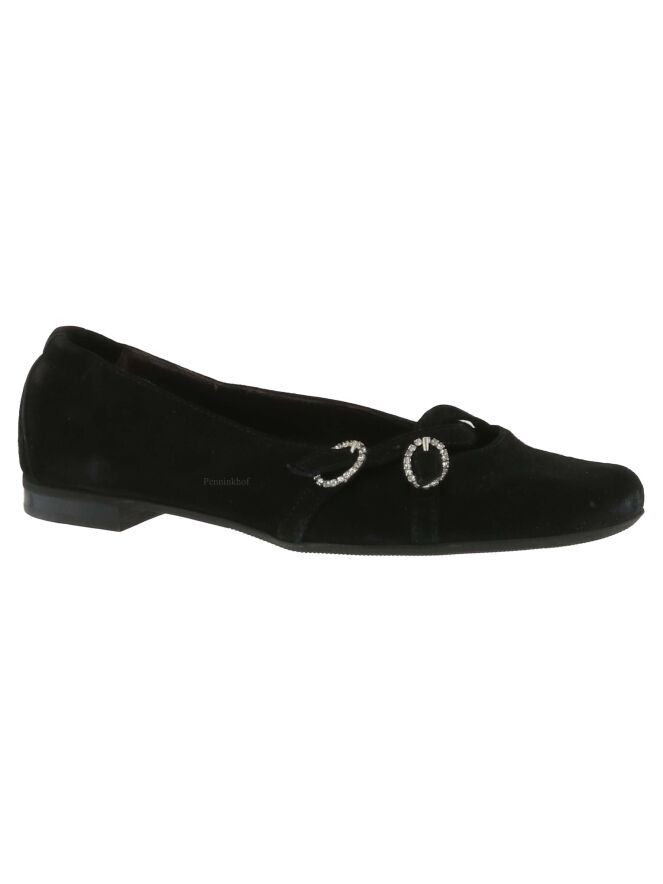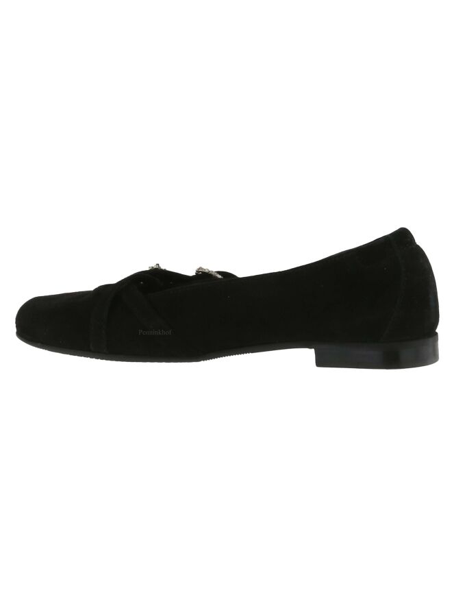 A slip-on of the AGL Attilio Giusti Leombruni brand in the color black. The slip-on has a square nose and 2 crossed piping over the forefoot with buckles decorated with rhinestone. The inside of the shoe is lined with leather.