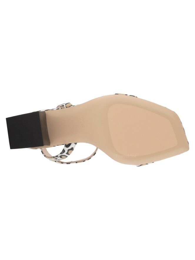 An open toe pump from AGL in a panther print with the colors camel, black and white. The ankle strap is adjustable. The design heel is in a glossy black color in a square shape.