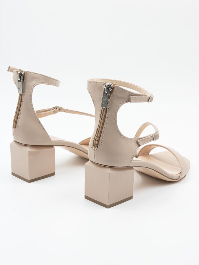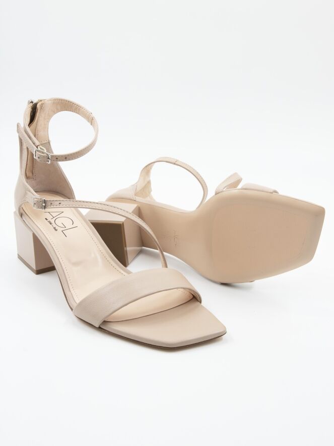 An open sandal or pump by AGL in nude color. Across the forefoot, there is a strap with a narrow trim that runs diagonally over the forefoot to the side of the heel. The heel strap is adjustable, and there is a short zipper on the heel. The design heel is in a shiny square shape. The leather is lined on the inside.
