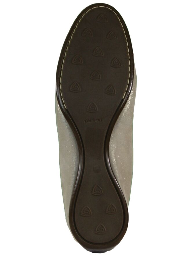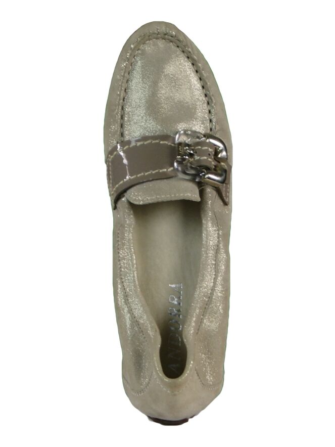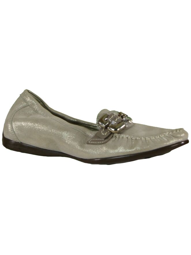 A slip-on of Attilio Giusti Leombruni in the color taupe. Around the foot and on the seams, the slip-on has been stitched with off white. On the forefoot is a strap in the paint with a silver colored buckle with a part in transparent plastic.