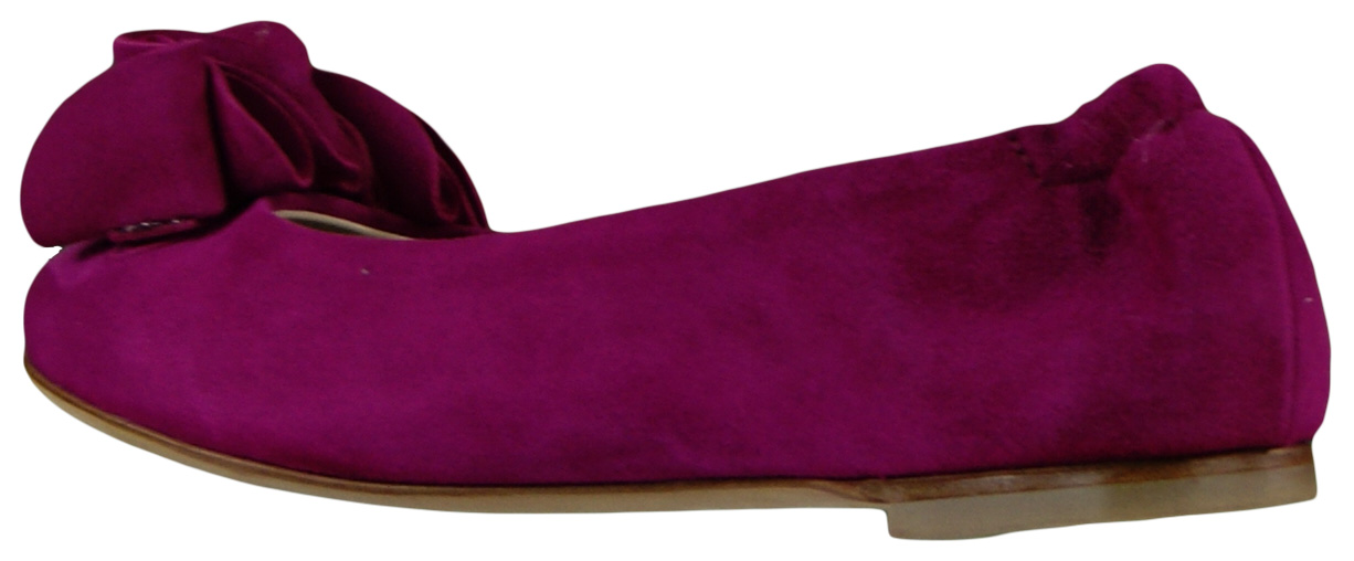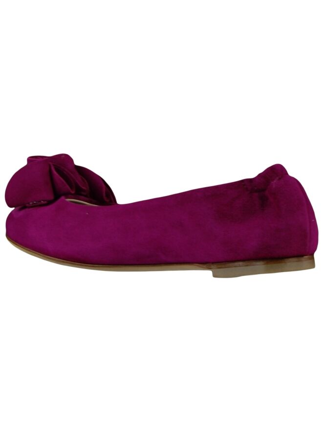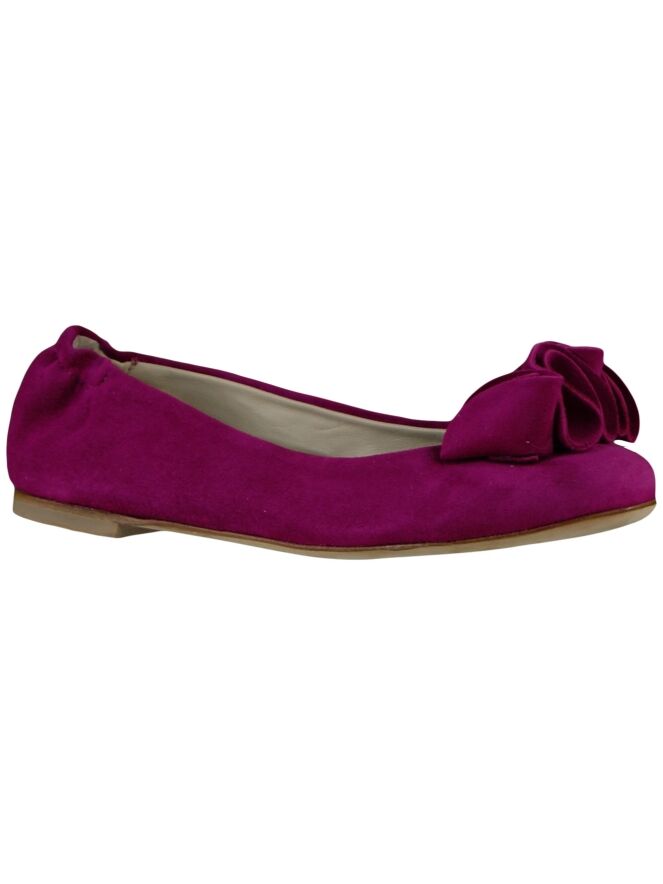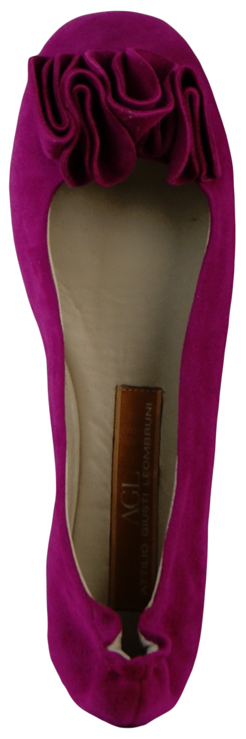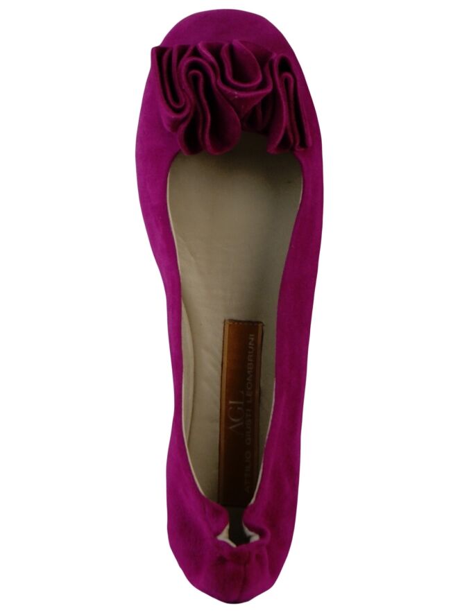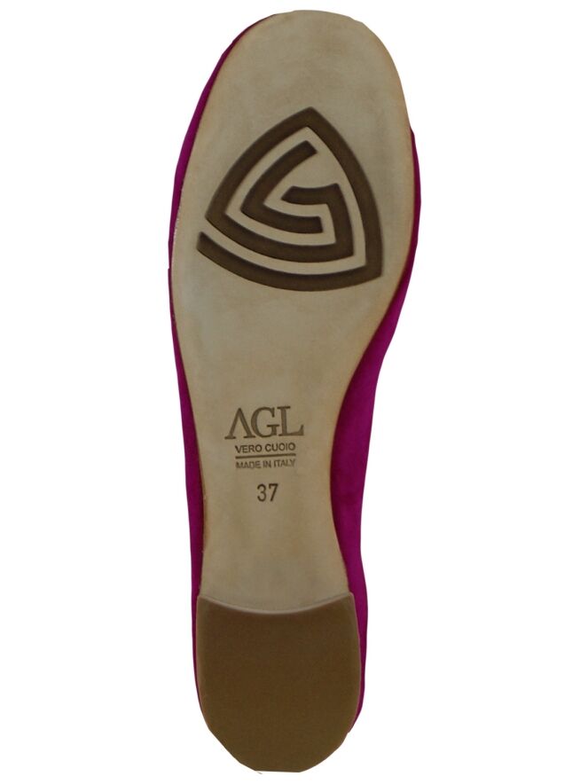 A ballerina from Attilio Giusti leombruni (AGL) in the color fuchsia. The ballerina has a round toe and decorative pleated suede on the forefoot. At the edge of the heel is a piece of elastic. The inside is lined with leather.