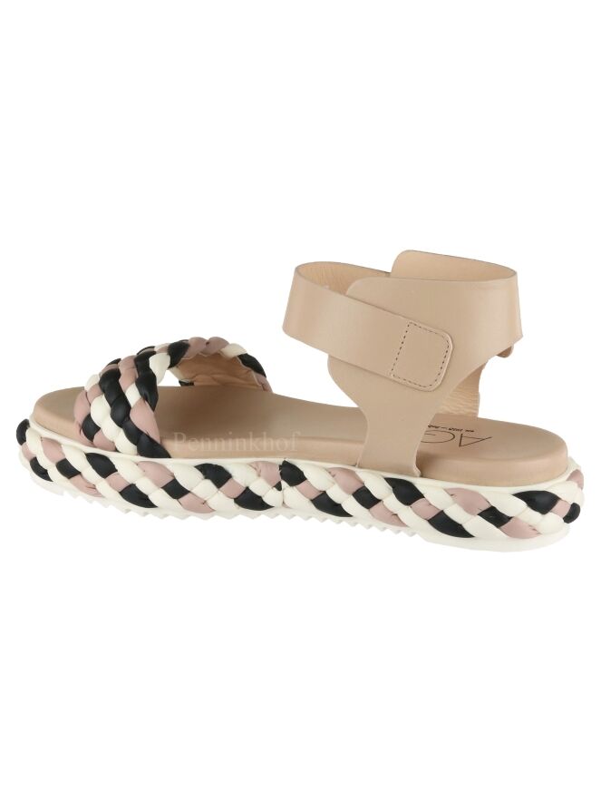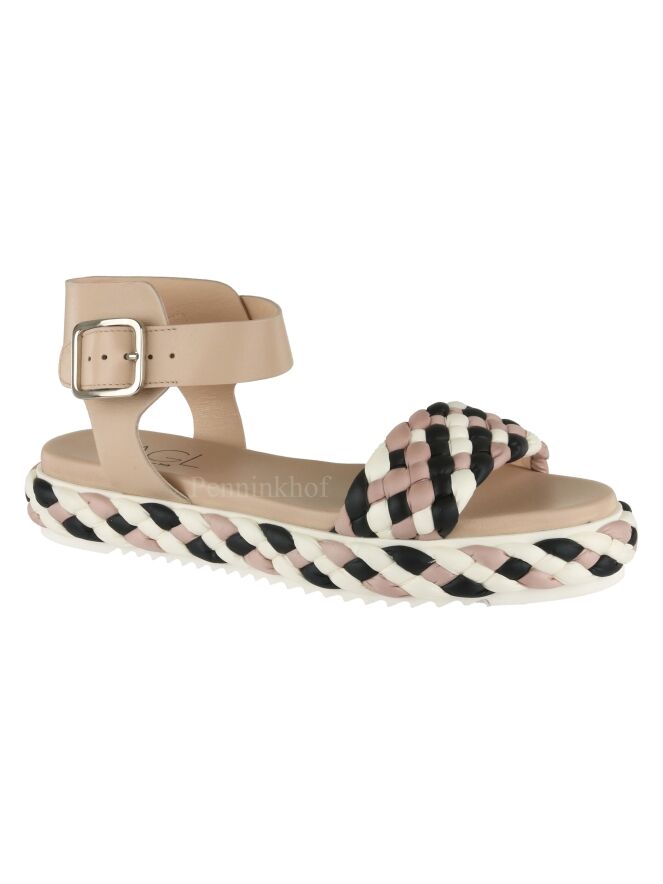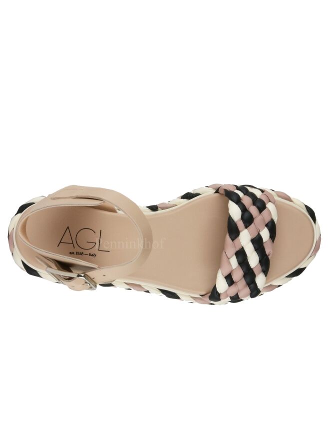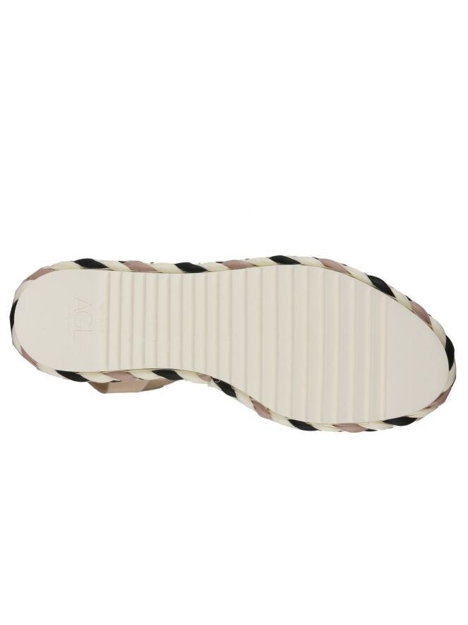 A sandal from AGL in the colors nude, cream white and black. On the forefoot and along the edge of the sole is a cross-striped parachute fabric. Between the insole and the side is a decorative creamy white trim. The ankle strap is adjustable.