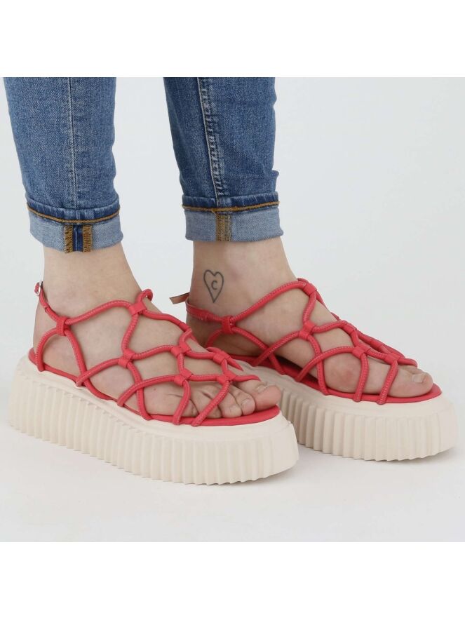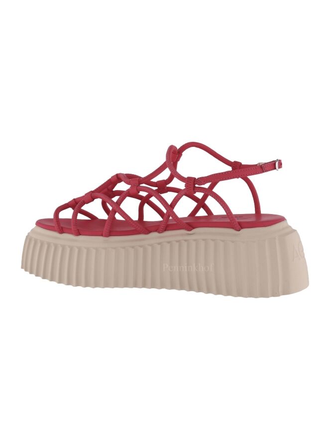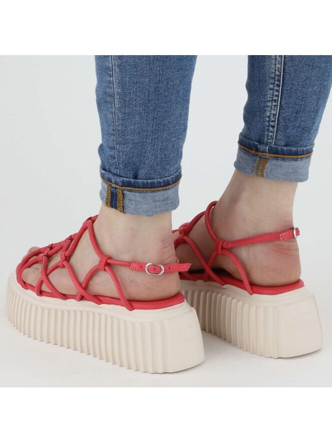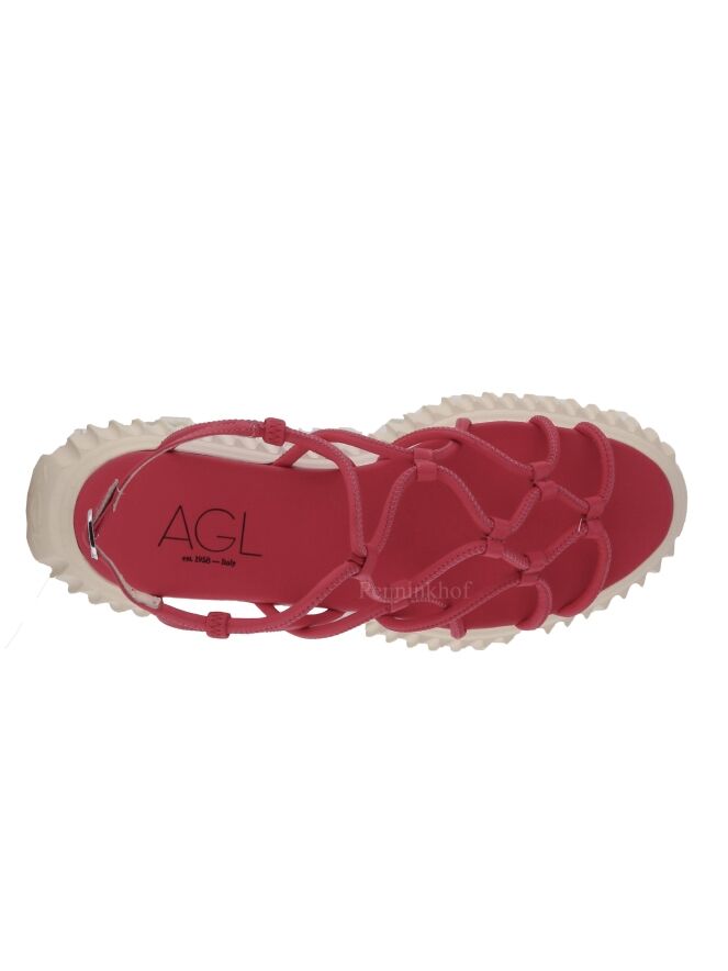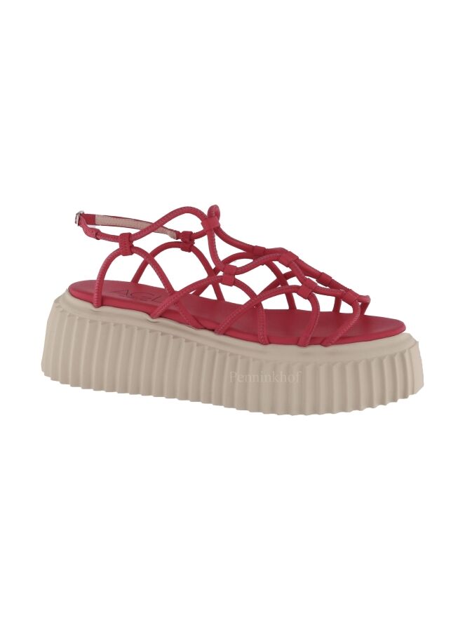 A sandal from AGL in the color raspberry red. Over the forefoot, leather cords are attached in a wavy pattern. The heel strap is adjustable. The platform sole is in a vertically ribbed structure.
