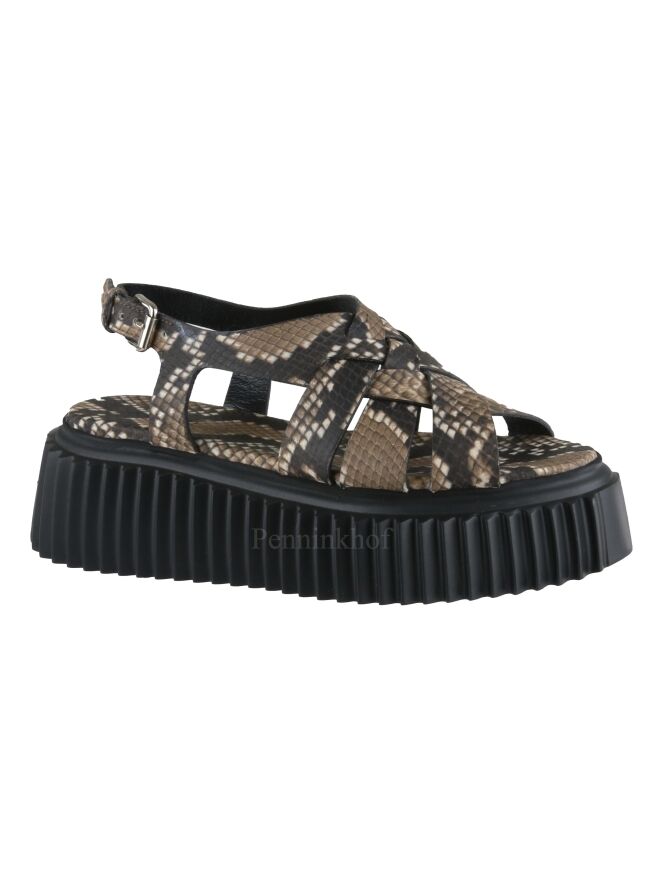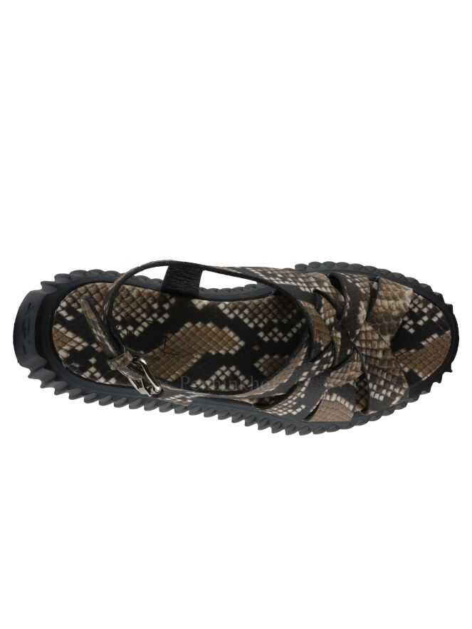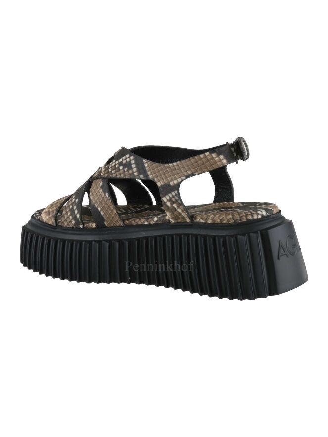 A sandal from AGL in a python print with multiple shades of brown, black and creamy white. The leather is crossed over the forefoot in piping. The heel strap is adjustable. The sturdy design sole is vertically serrated.