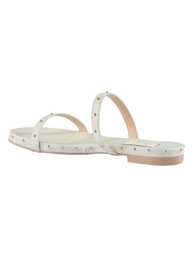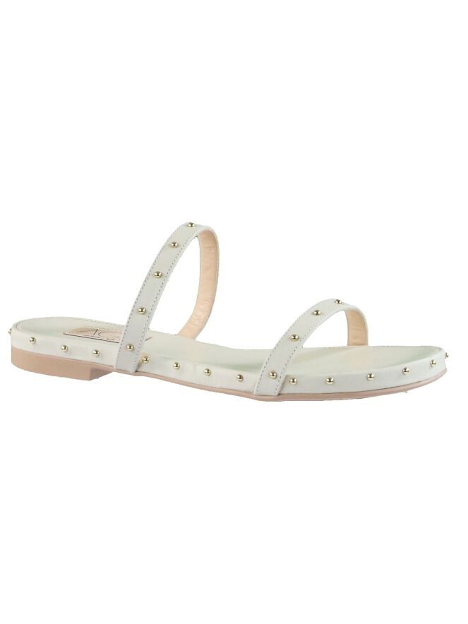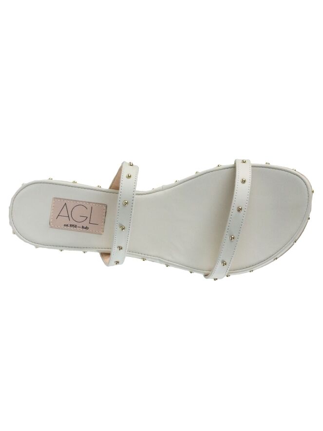 A sandal from Attilio Giusti Leombruni in cream white. Over the forefoot are 2 leather bands with gold colored decorative studs. These studs are also along the edge of the sole.