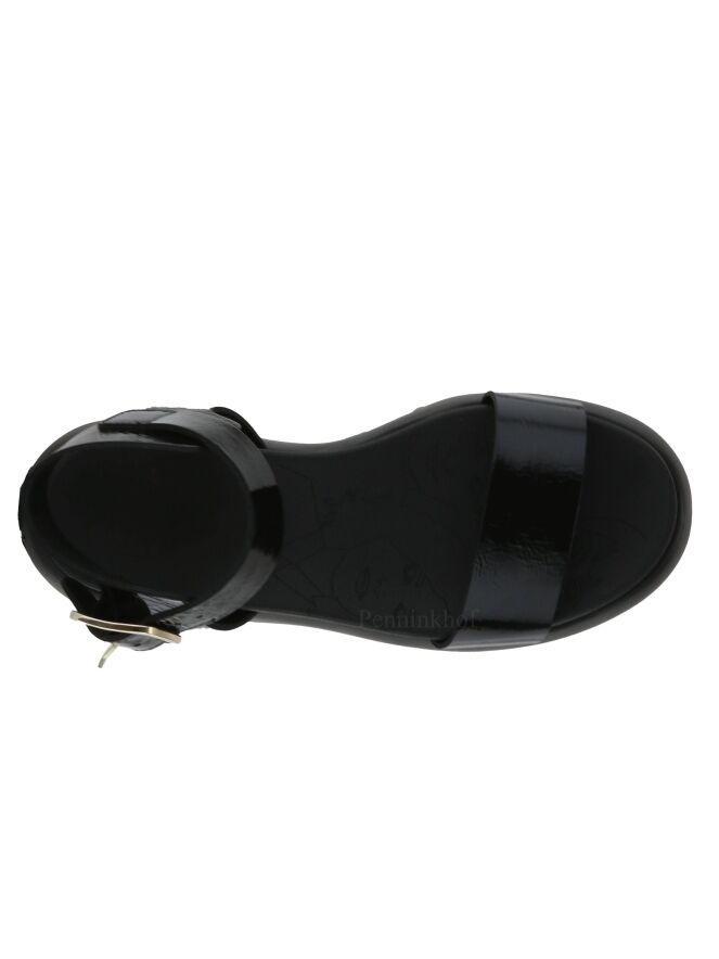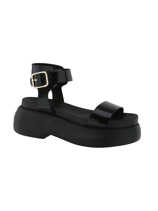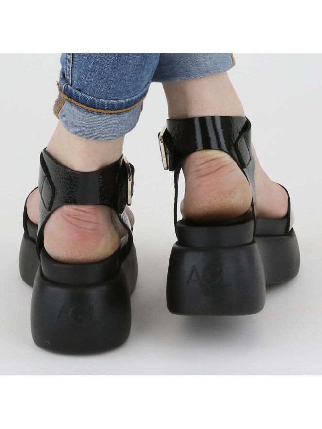 A sandal from AGL in patent leather in the color nude. The sandal has a design platform sole with a luxurious footbed with a graphic print of the 3 daughters of AGL. Over the forefoot is a patent leather strap. The ankle strap is adjustable.