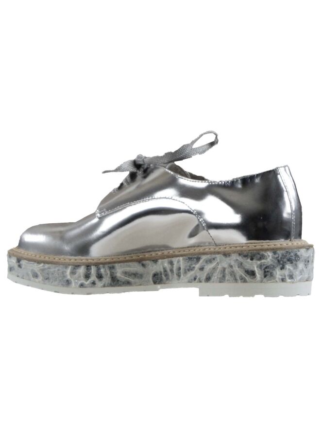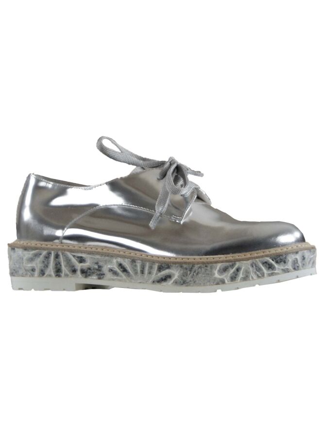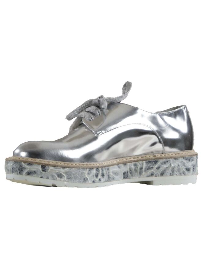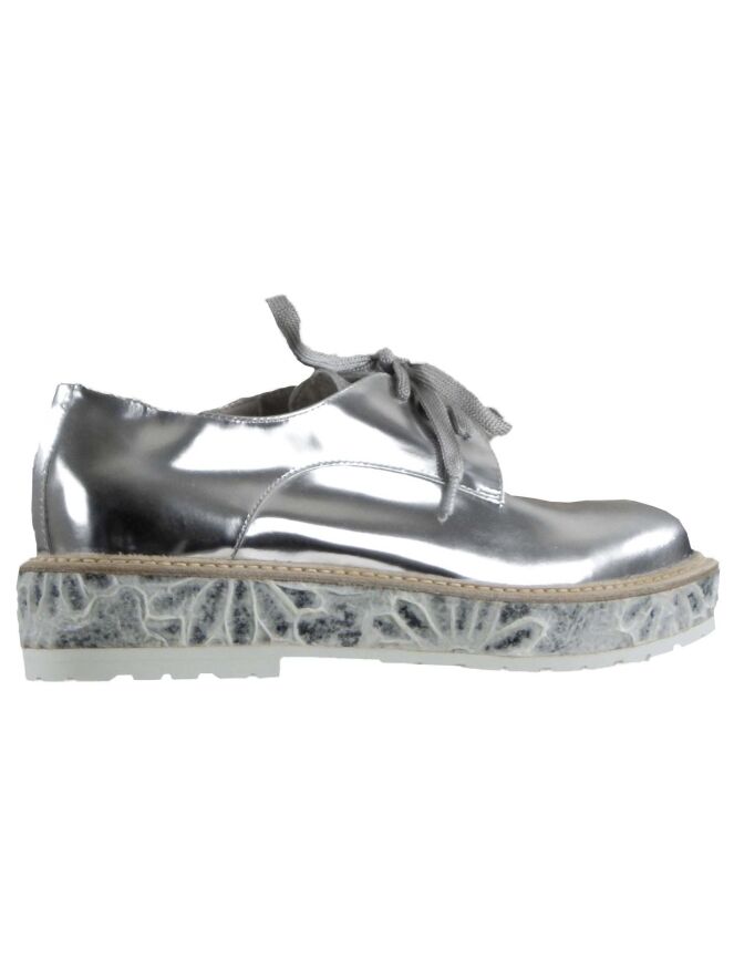 A loafer of the brand AGL in the color silver. The slip-on is put on a 3 cm high sole which with a relief print is finished with a thin white sole for the tread. The inside of the shoe is lined with leather.