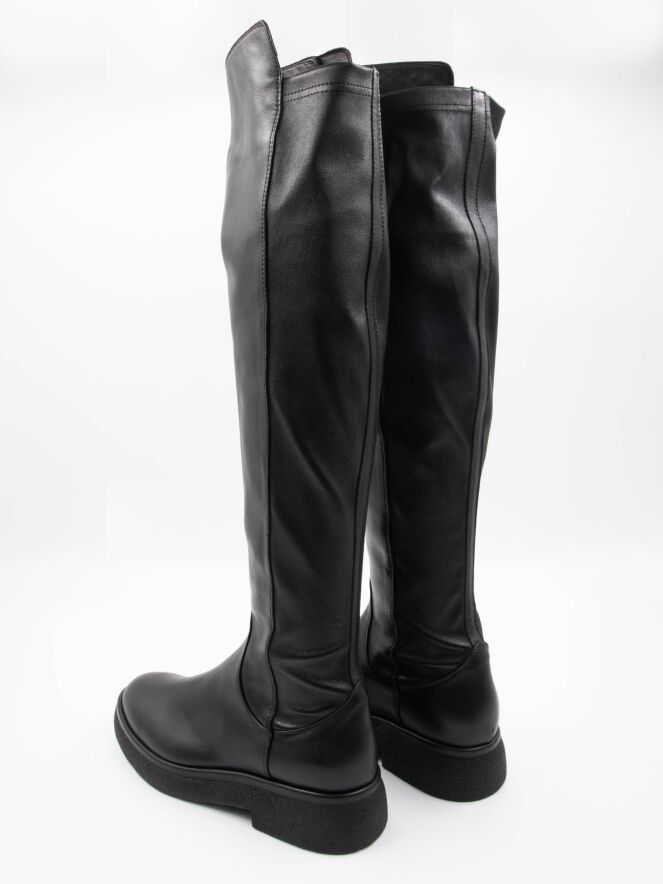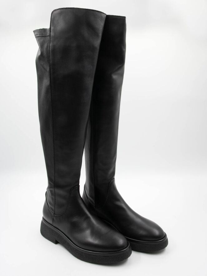 A luxurious high tube boot from AGL in black. The forefoot and front of the shaft are made of soft and supple nappa leather, while the back of the shaft is crafted from a luxurious stretch imitation leather.