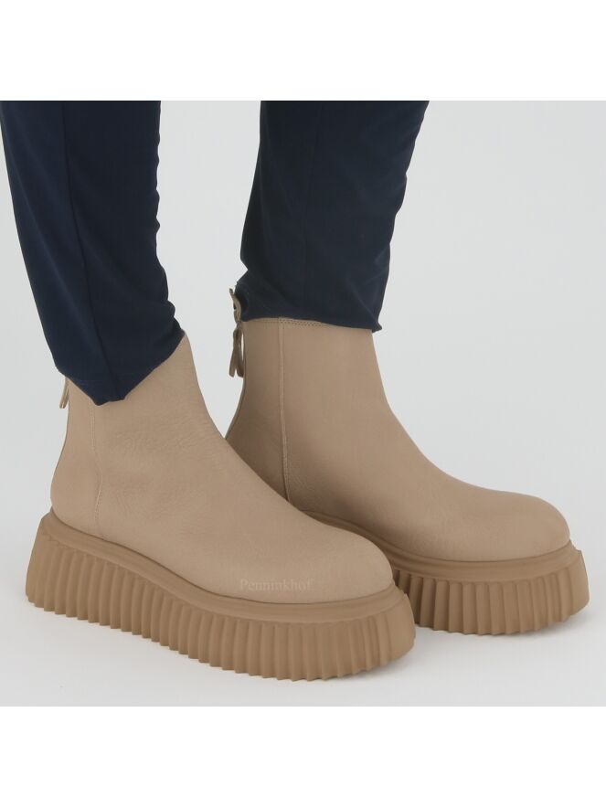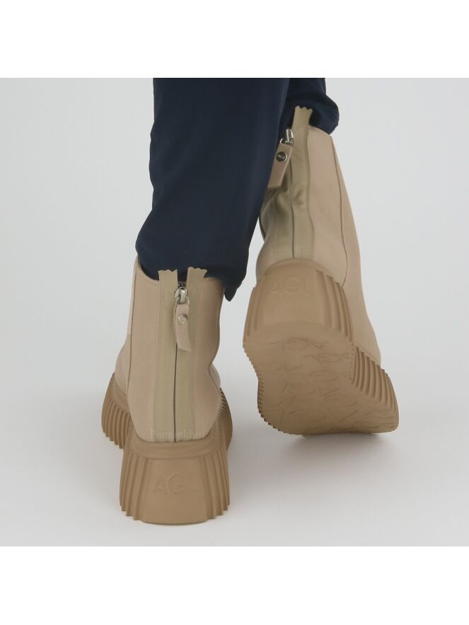 A short boot from AGL in the color nude. The boot has a ribbed design platform sole. At the back of the shaft is a zipper. The inside is lined with leather.