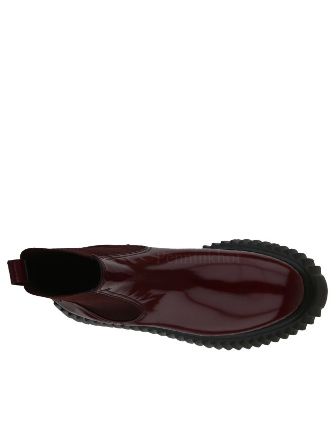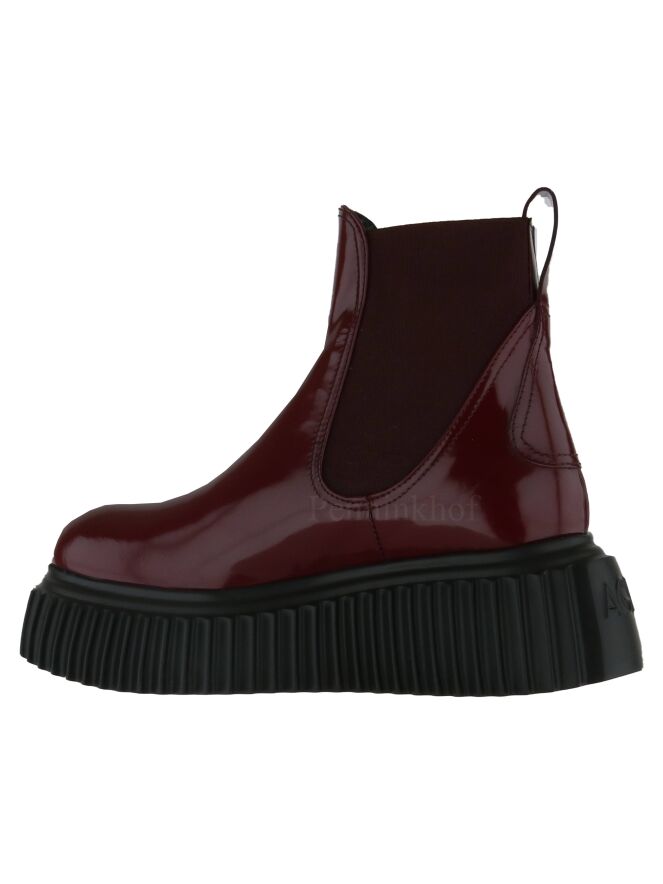A short boot from AGL in the color burgundy red. The boot has a ribbed design platform sole in the color black. On both sides of the shaft is a fine ribbed elastic fabric. The inside is lined with leather.