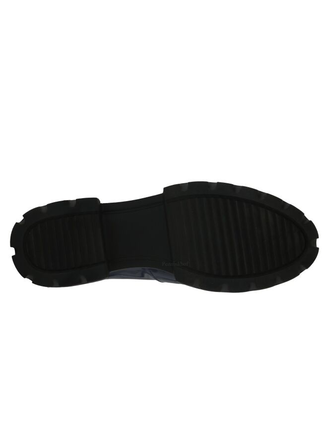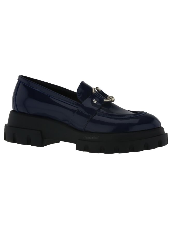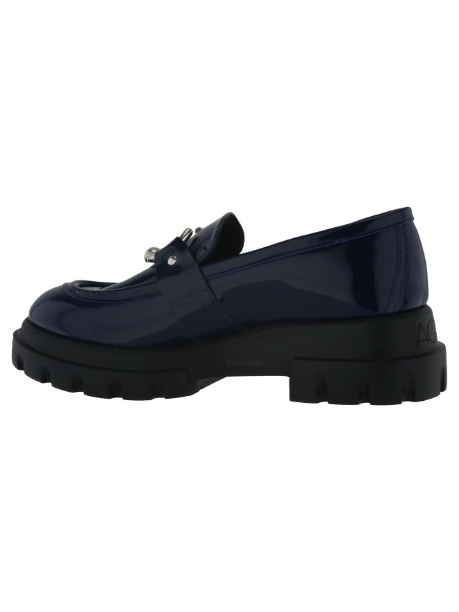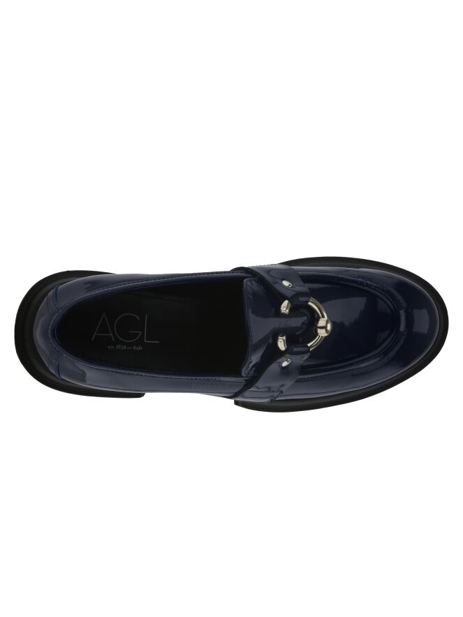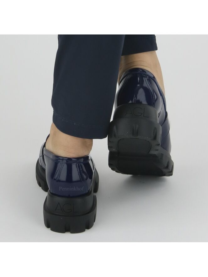 A slip-on from AGL in patent leather in the color midnight blue. The shoe has a design serrated platform sole. on the forefoot is a decorative silver-colored bit. The inside is lined with leather.