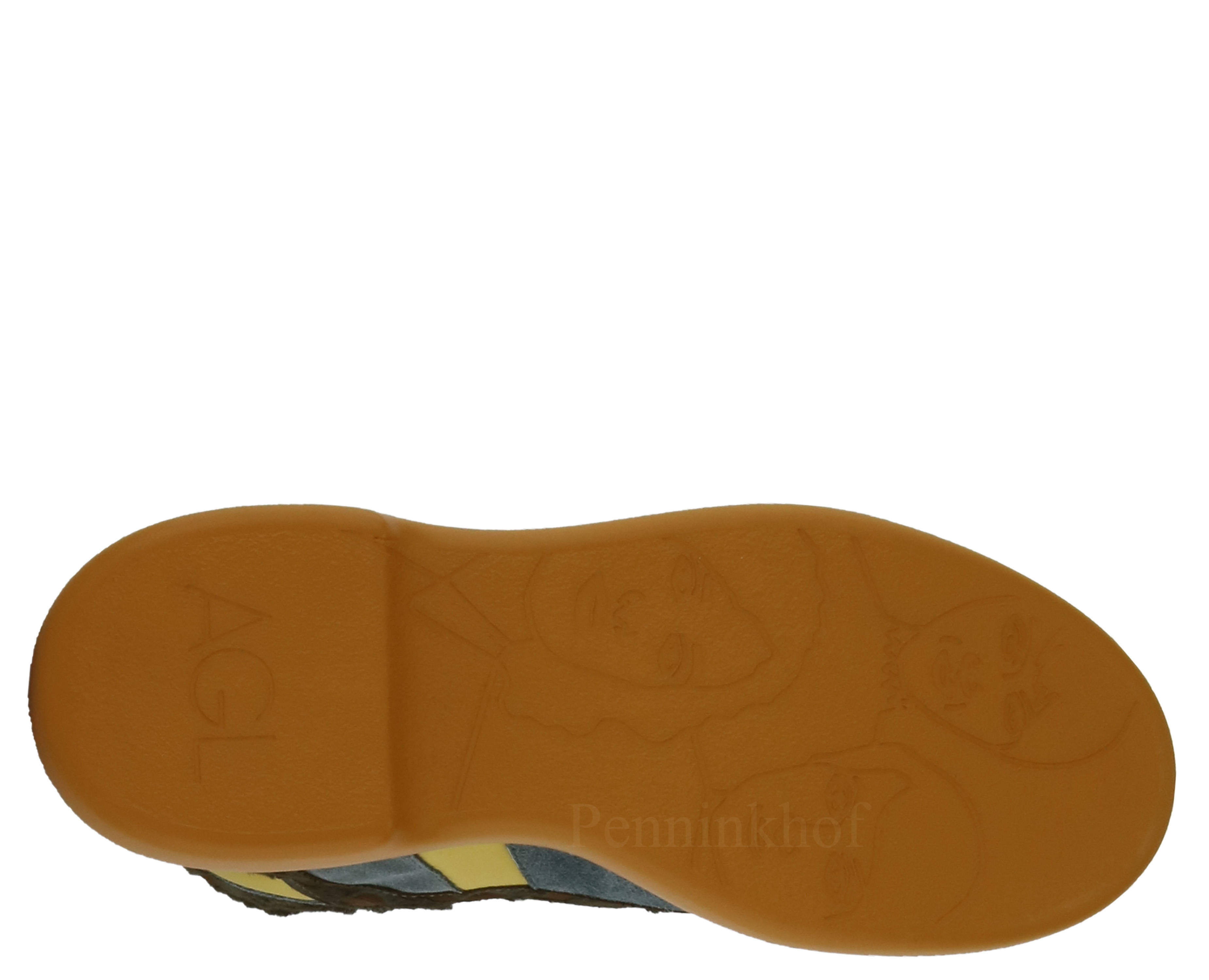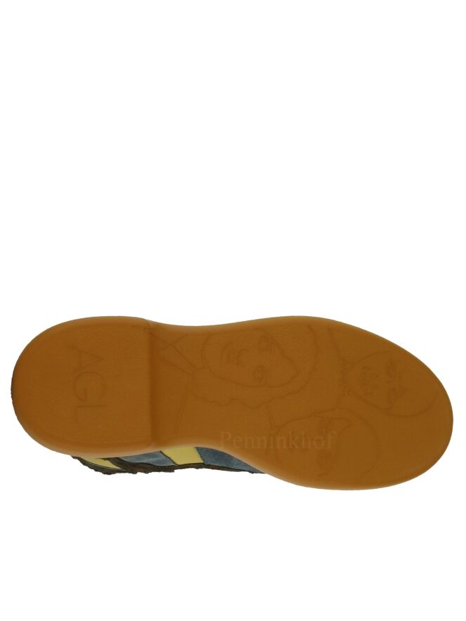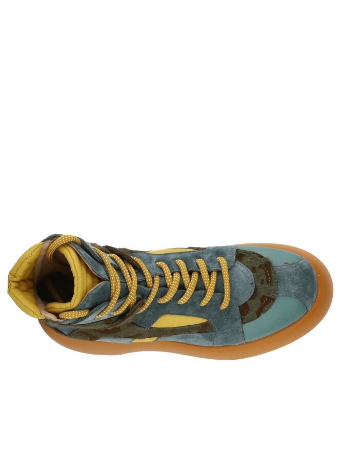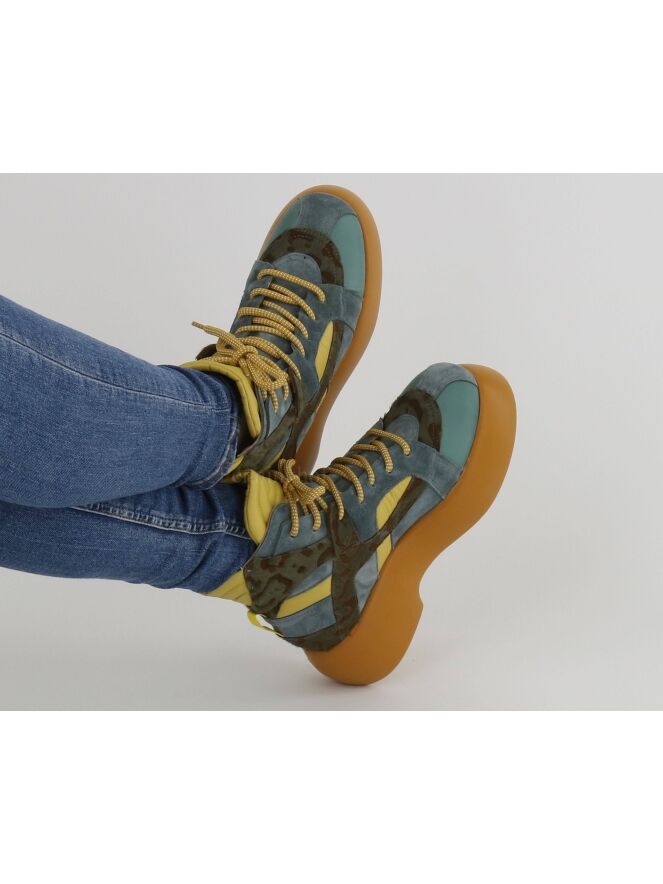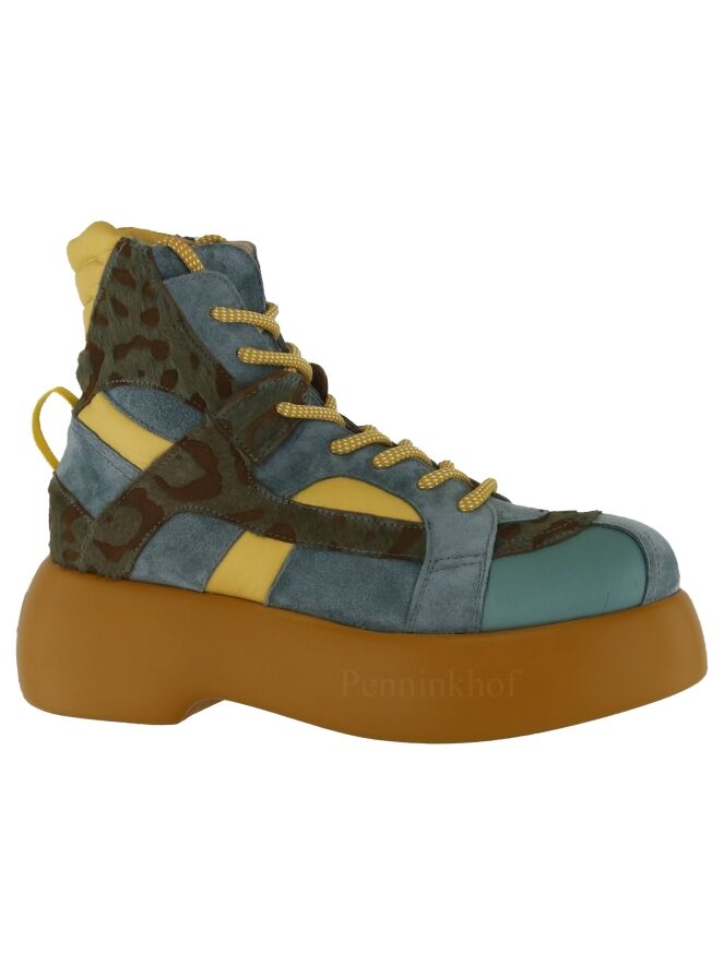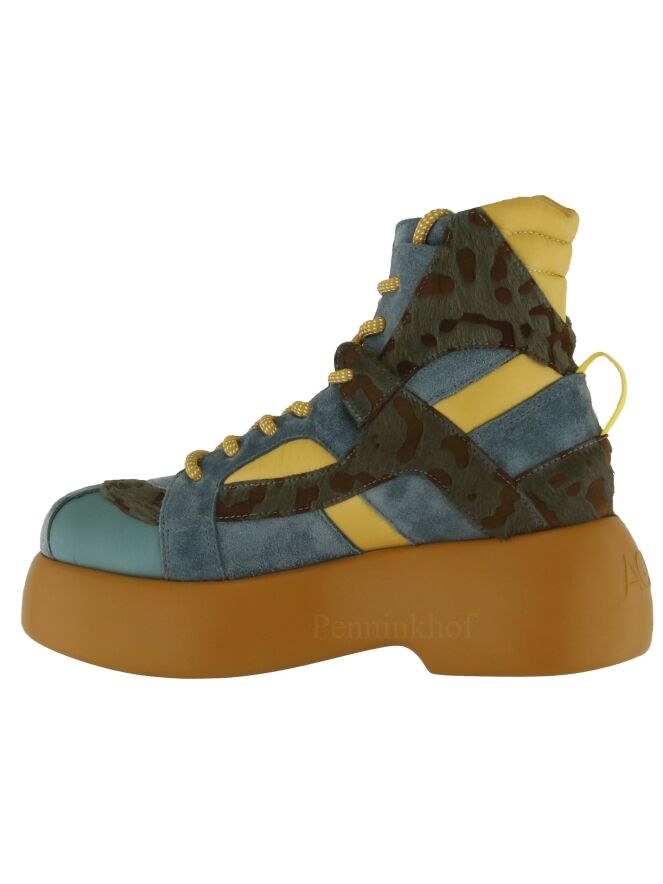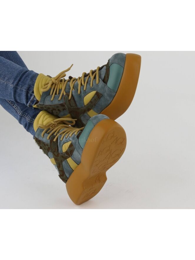 A short lace-up boot from AGL in a striped pattern of leather, suede and patent leather with multiple shades of jeans blue, pastel yellow and a panther print with jeans blue and cognac. The boot has a platform sole in the color camel. The inside is lined with leather.