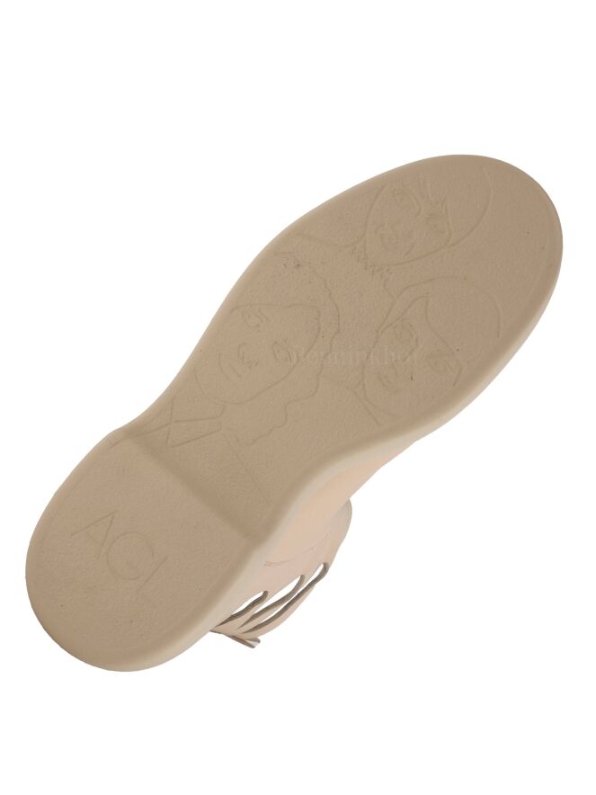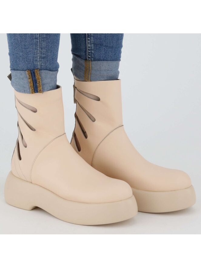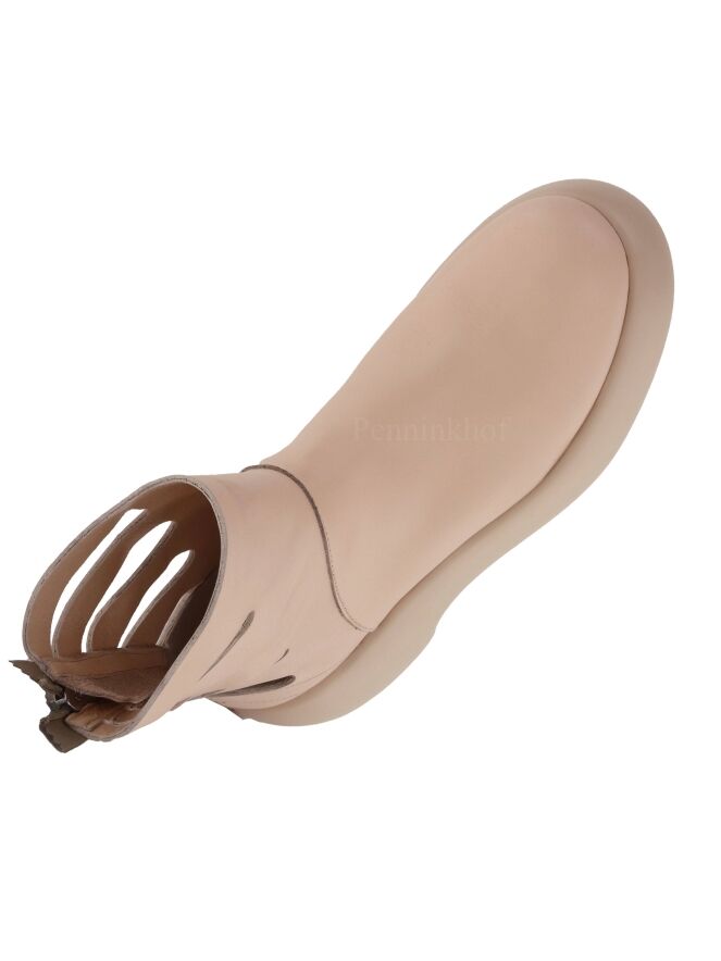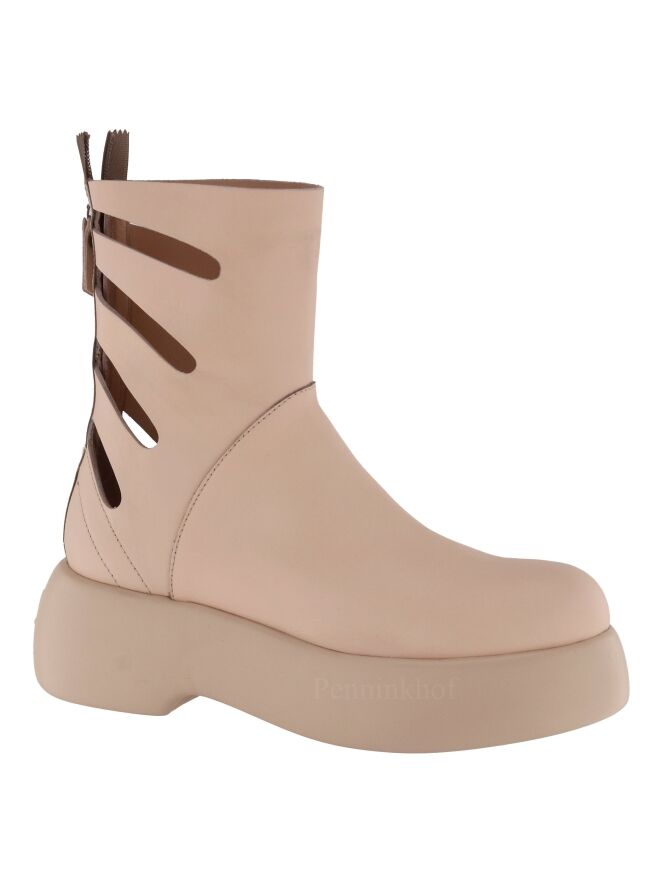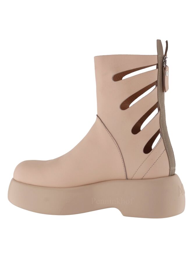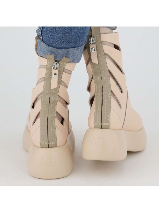A boot from AGL in the color nude. The boot has a design platform sole in a pastel nude color. The sides of the shaft have elongated openings. At the back of the shaft is a zipper.