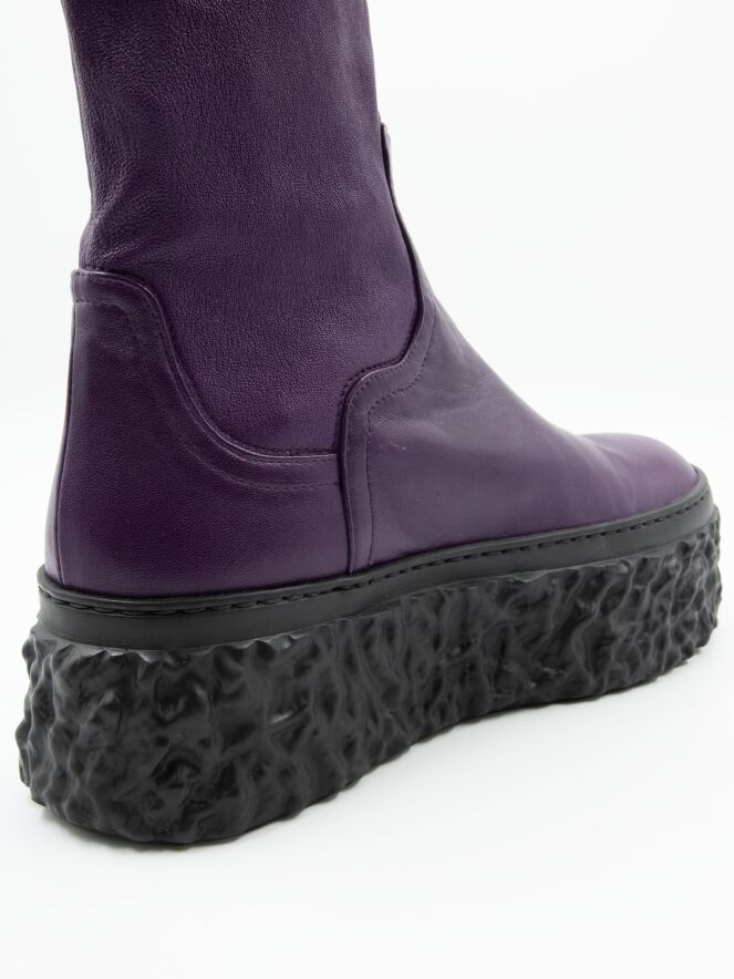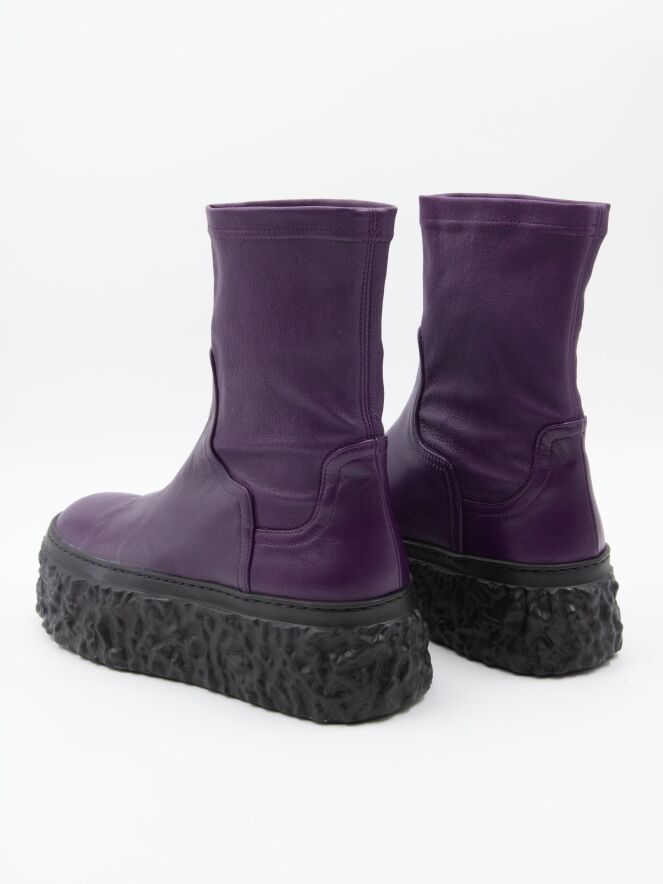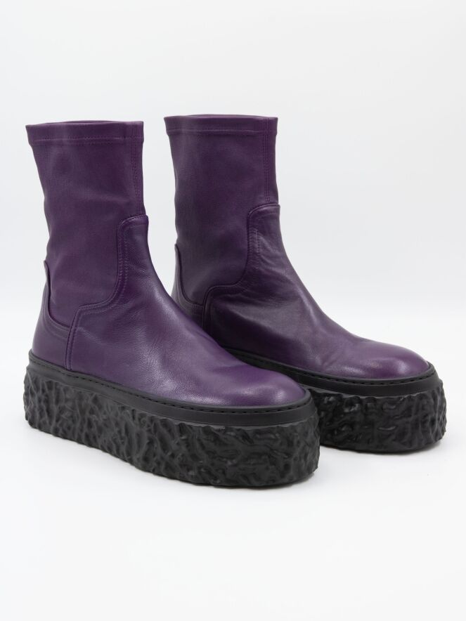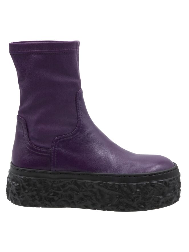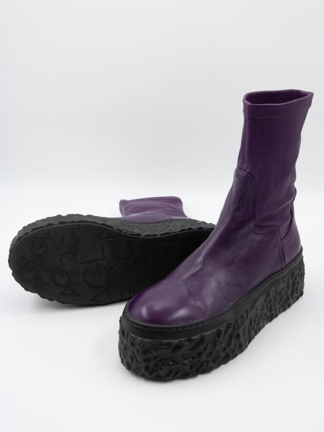 An ankle boot by AGL in purple color. The black designer platform sole is ribbed and uneven. The shaft is made of stretchy faux leather that fits snugly around the leg.