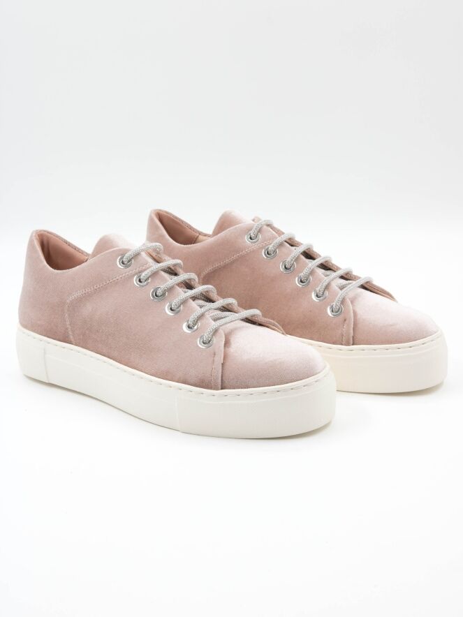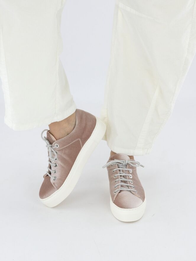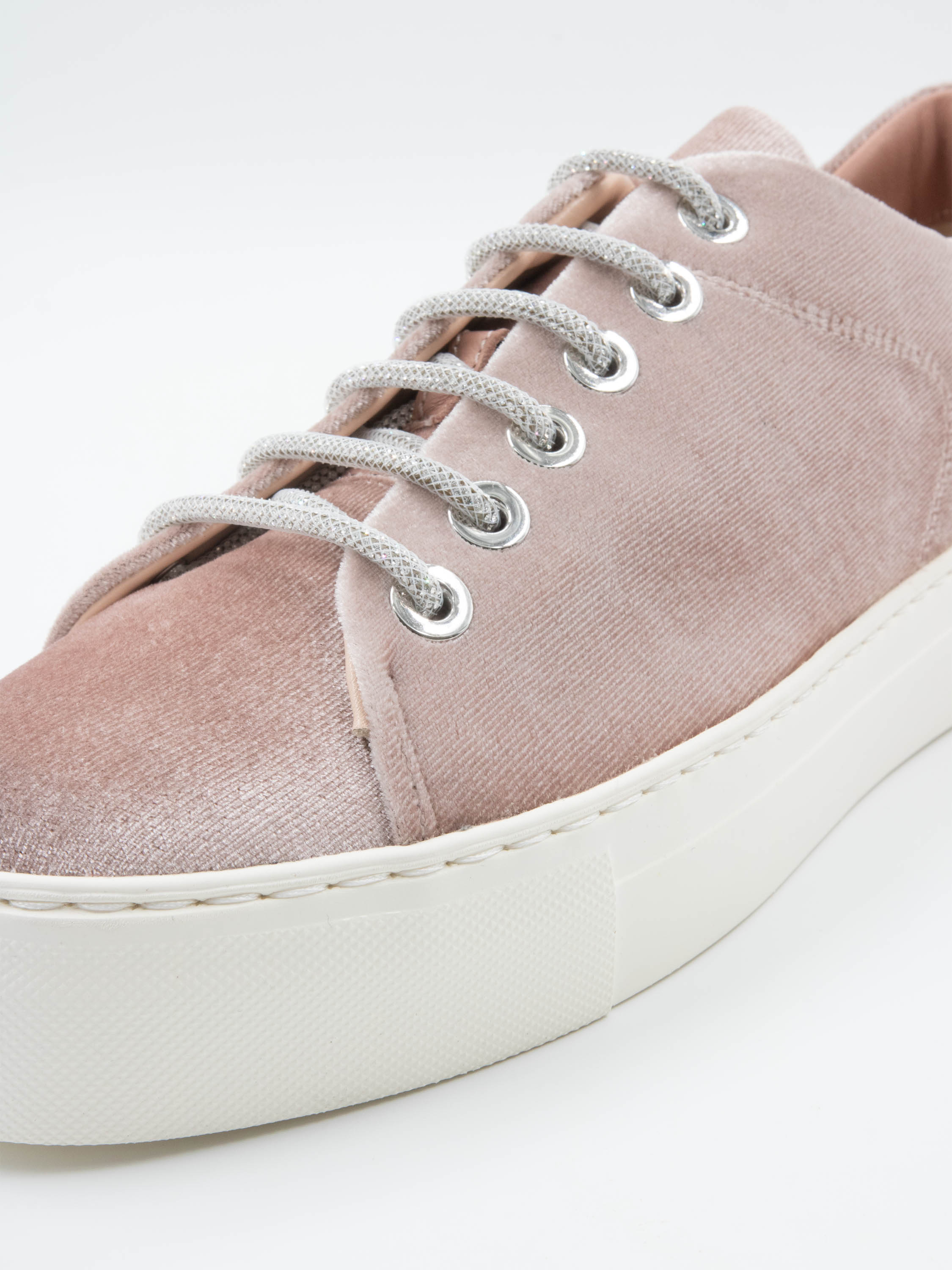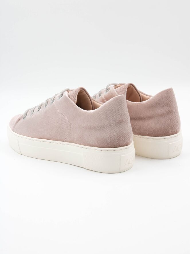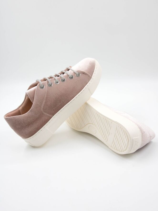 A luxurious velvet sneaker from AGL in pink. The laces are made of a shiny material, and the lace holes are crafted with silver-colored metal. The platform sole is light grey. The interior is lined with leather.
