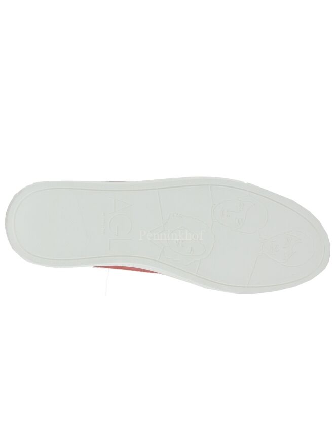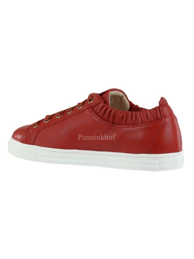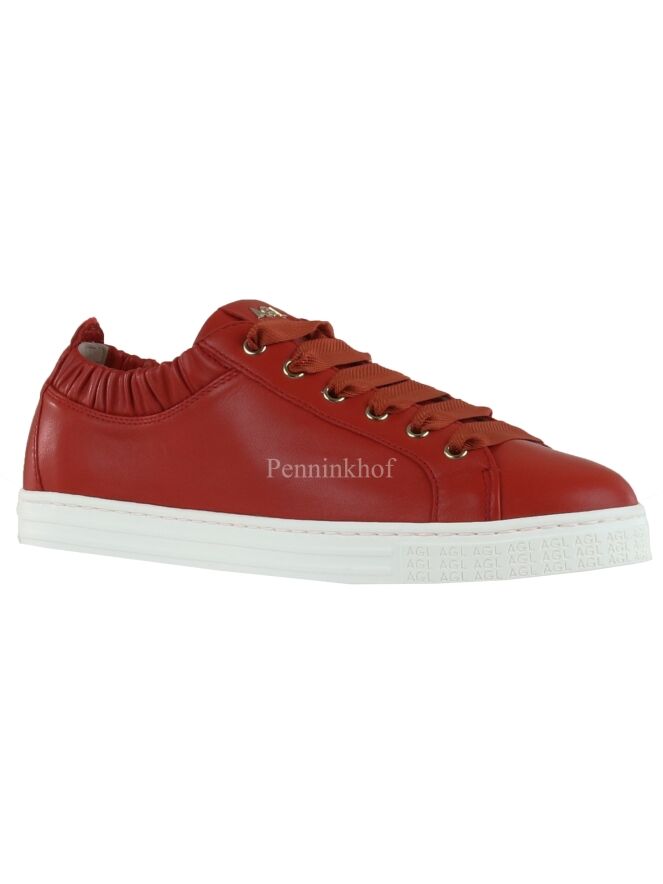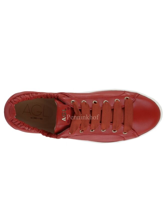 A luxurious sneaker from Attilio Giusti Leombruni (AGL) in a coral red color. The sneaker has satin laces in the same color as the sneaker. Along the edge of the shaft is a smocked trim with elastic. The insole is removable and the inside is lined with leather.