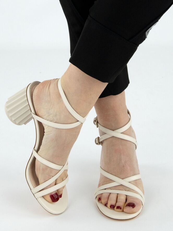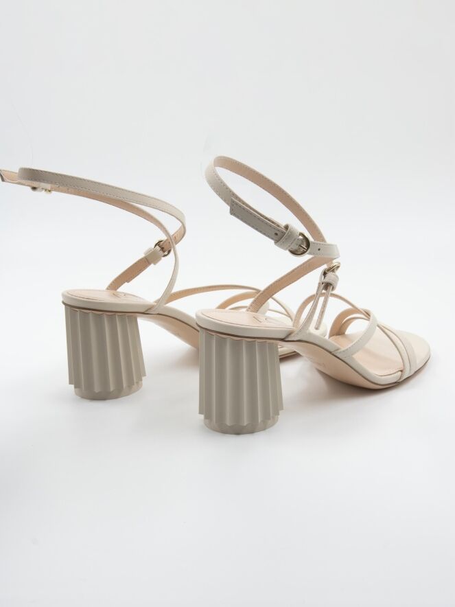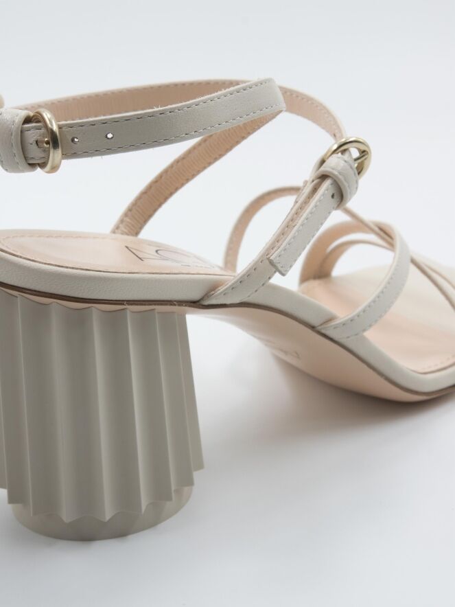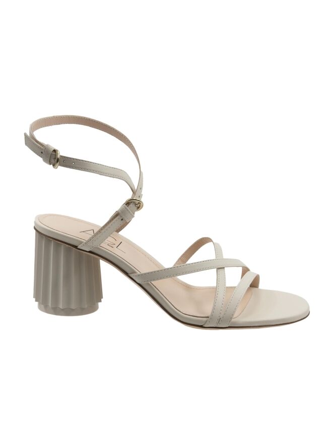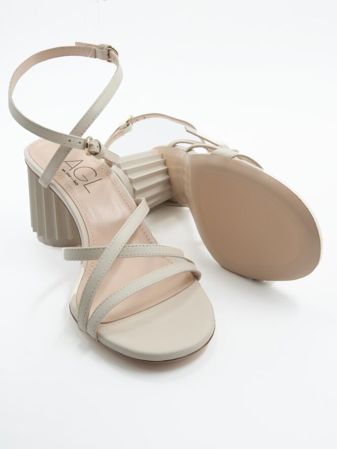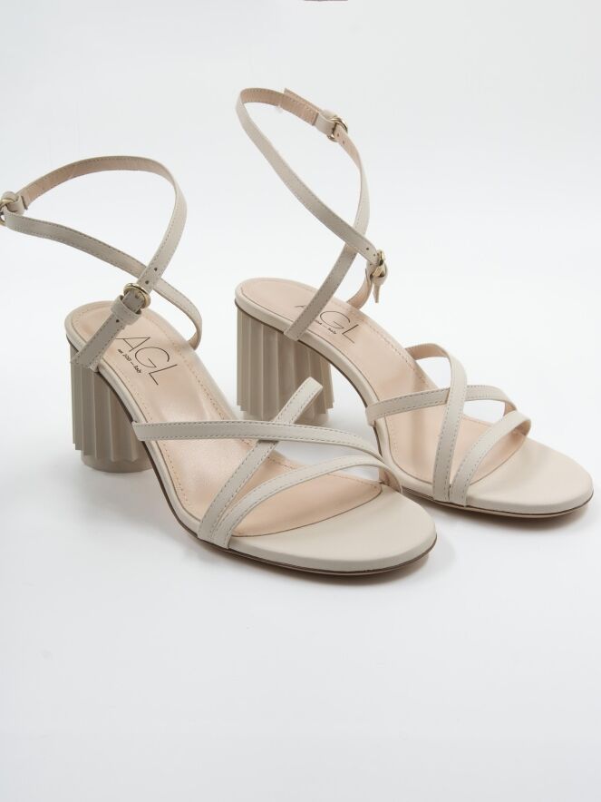 An open pump by AGL in cream white color. Over the forefoot, there is a trim, with two narrow trims running diagonally from it across the forefoot to the side. The heel strap is adjustable in two positions. The design heel is in a shiny, round pleated shape in the color of the leather. The leather is lined on the inside.