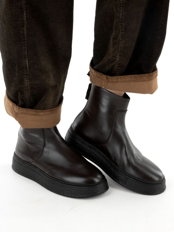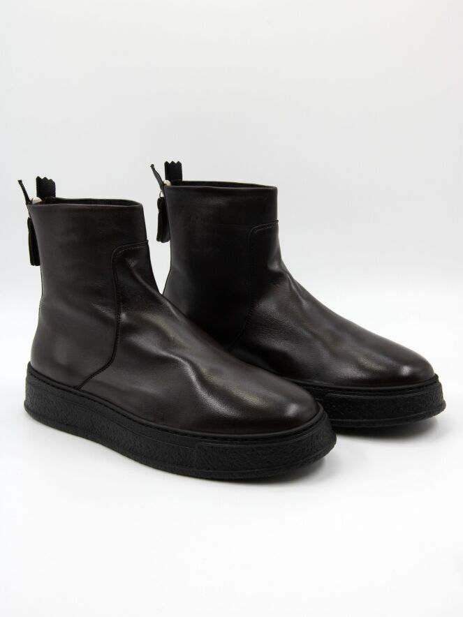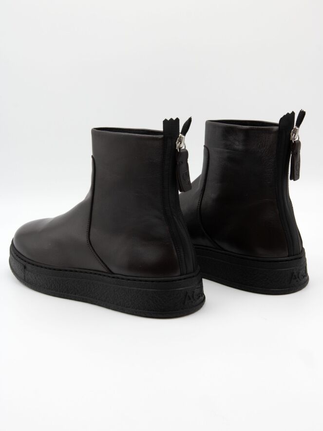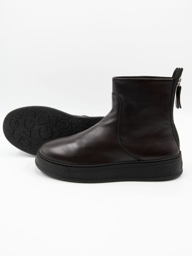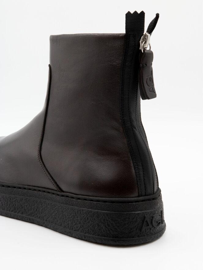 Short ankle boot by AGL in a dark mocha brown shade. The sole is black. There is a zip fastening at the heel. The inside of the shaft is leather-lined and the insole is covered with mouton.