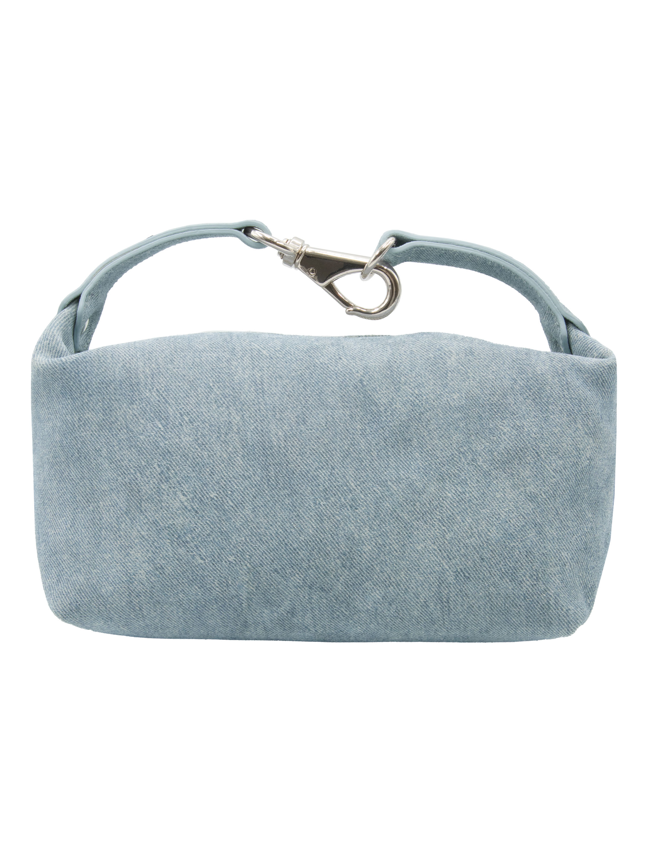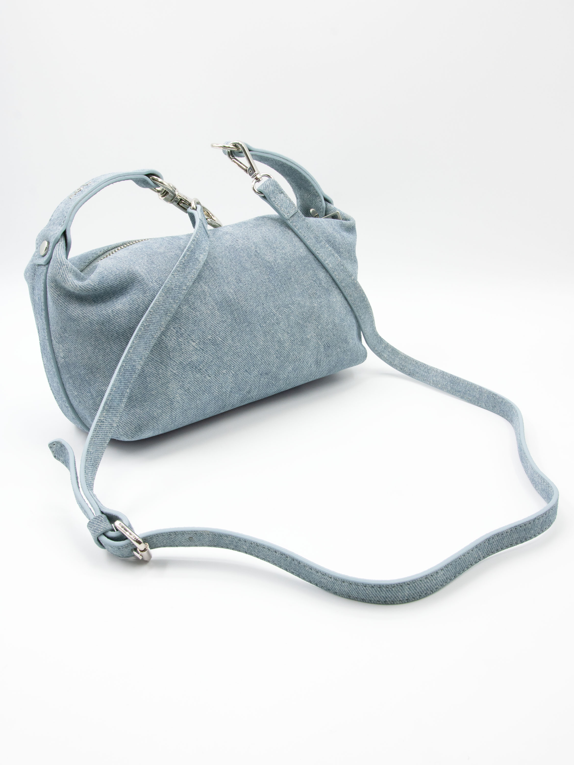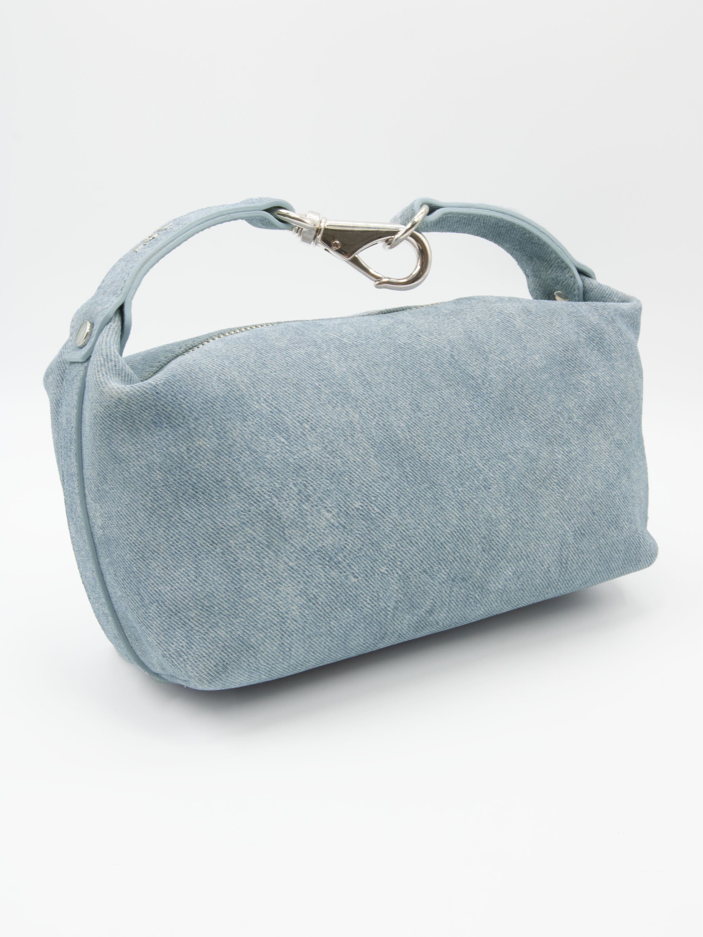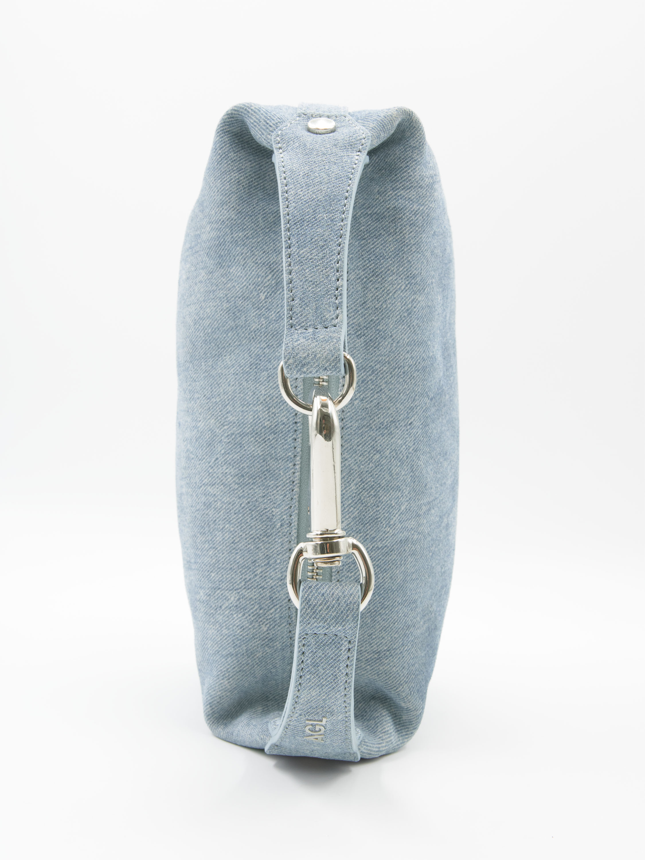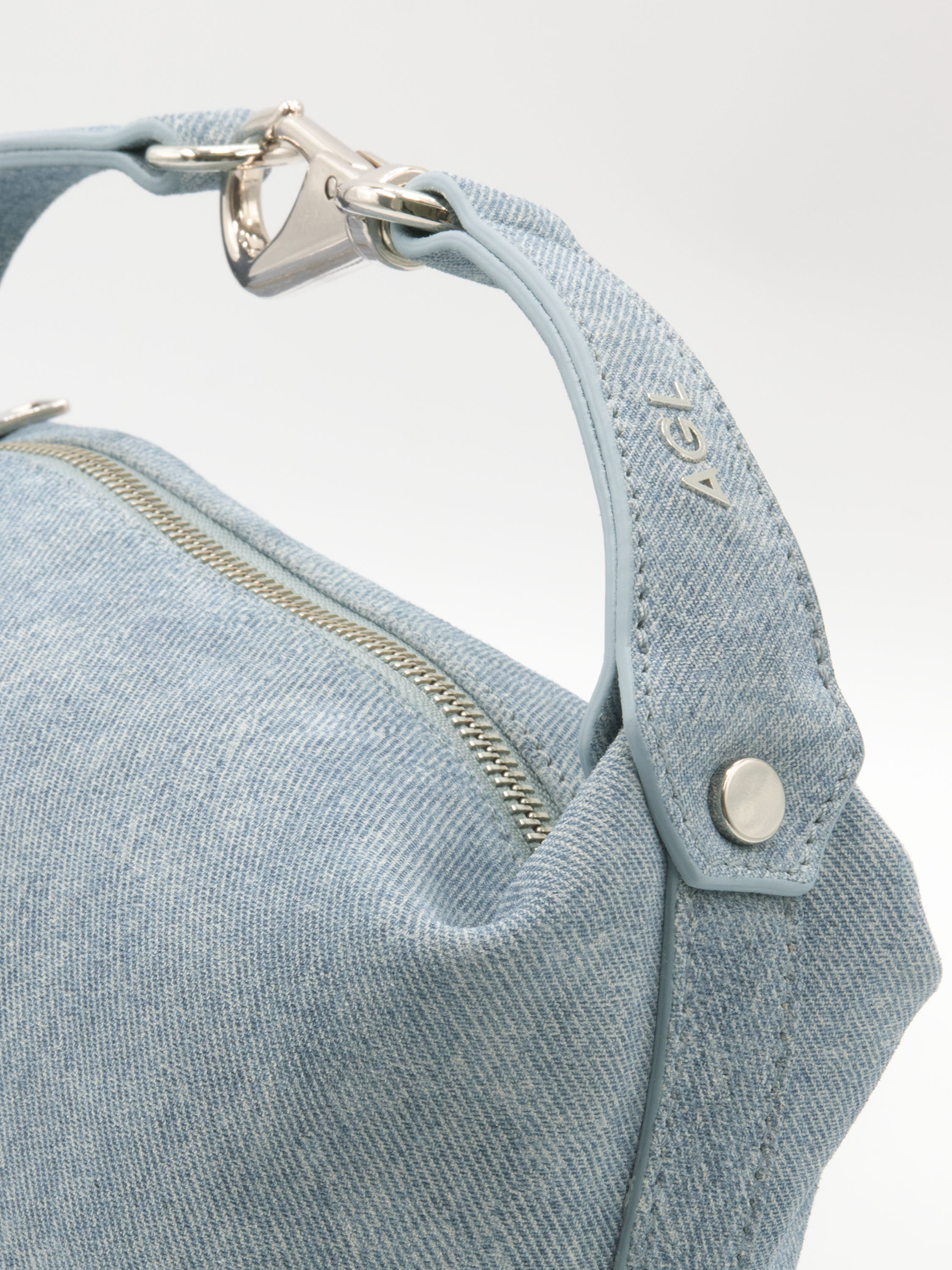 A AGL bag in a denim shade. The bag features a short handle with a decorative metal clip closure at the center. It is also equipped with a zip closure for secure storage.
